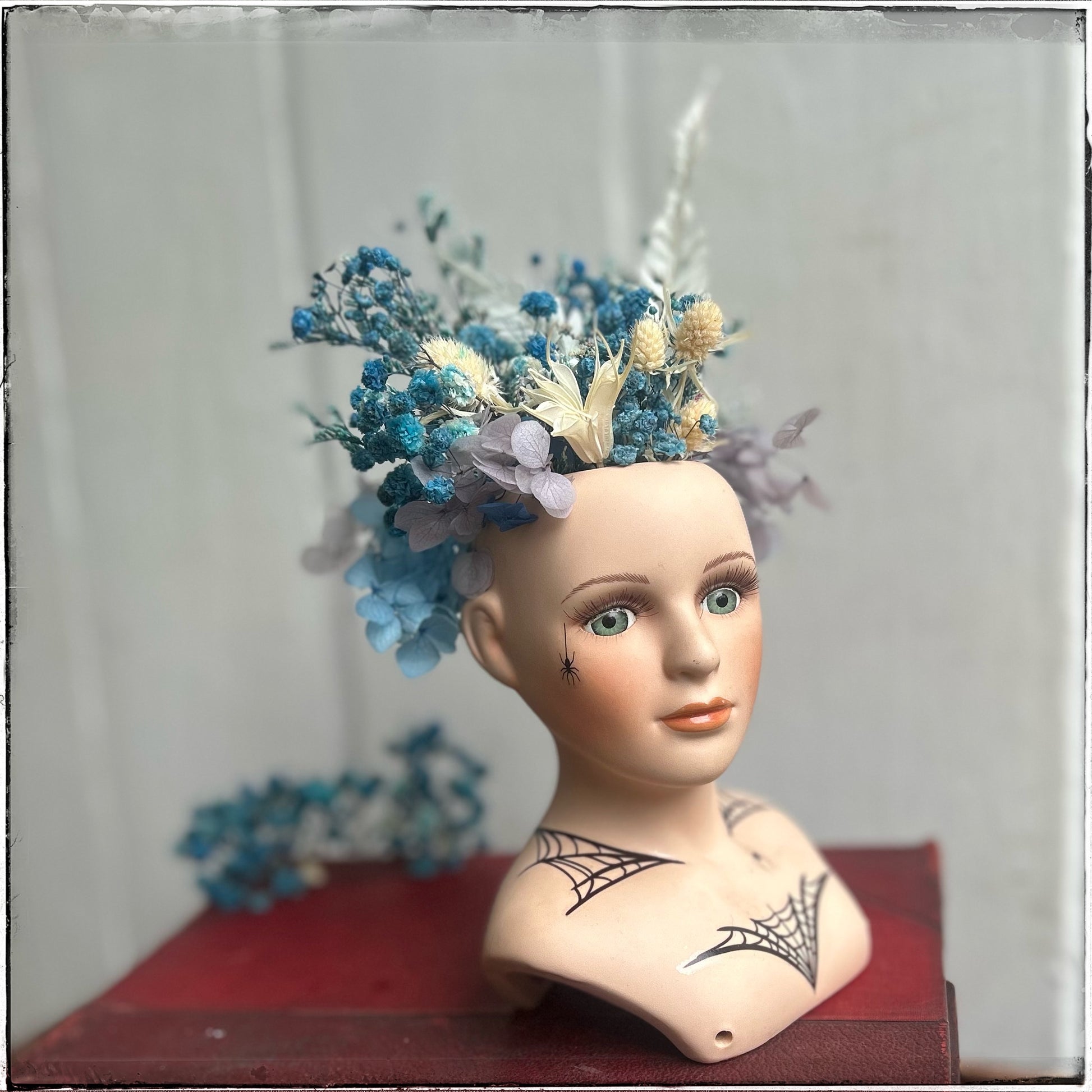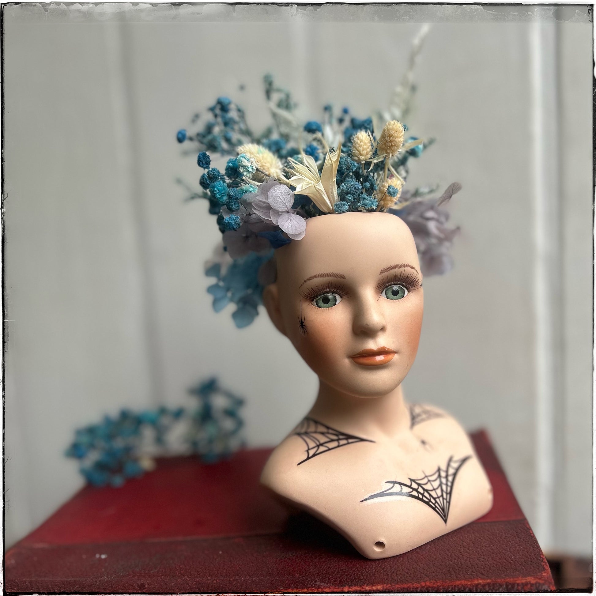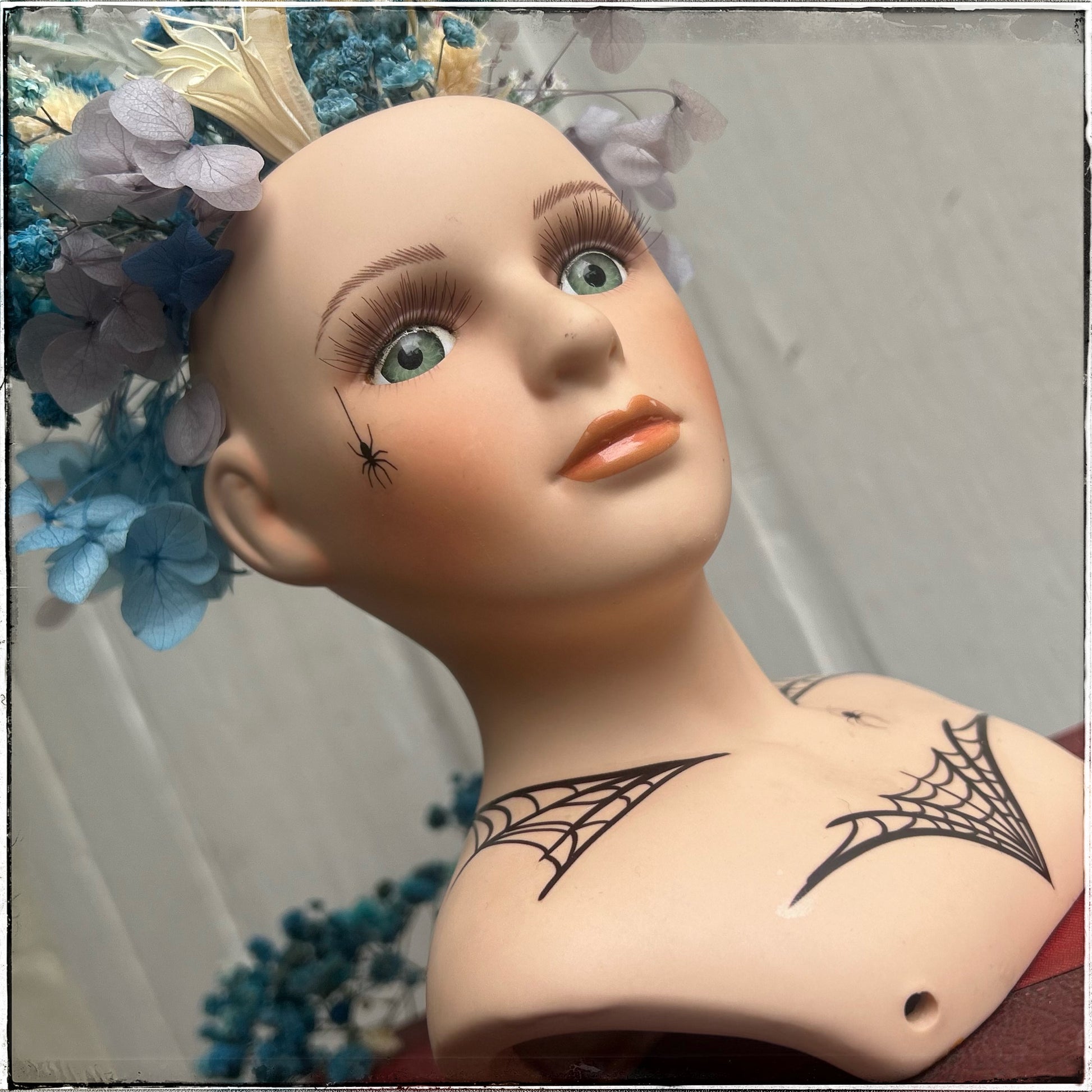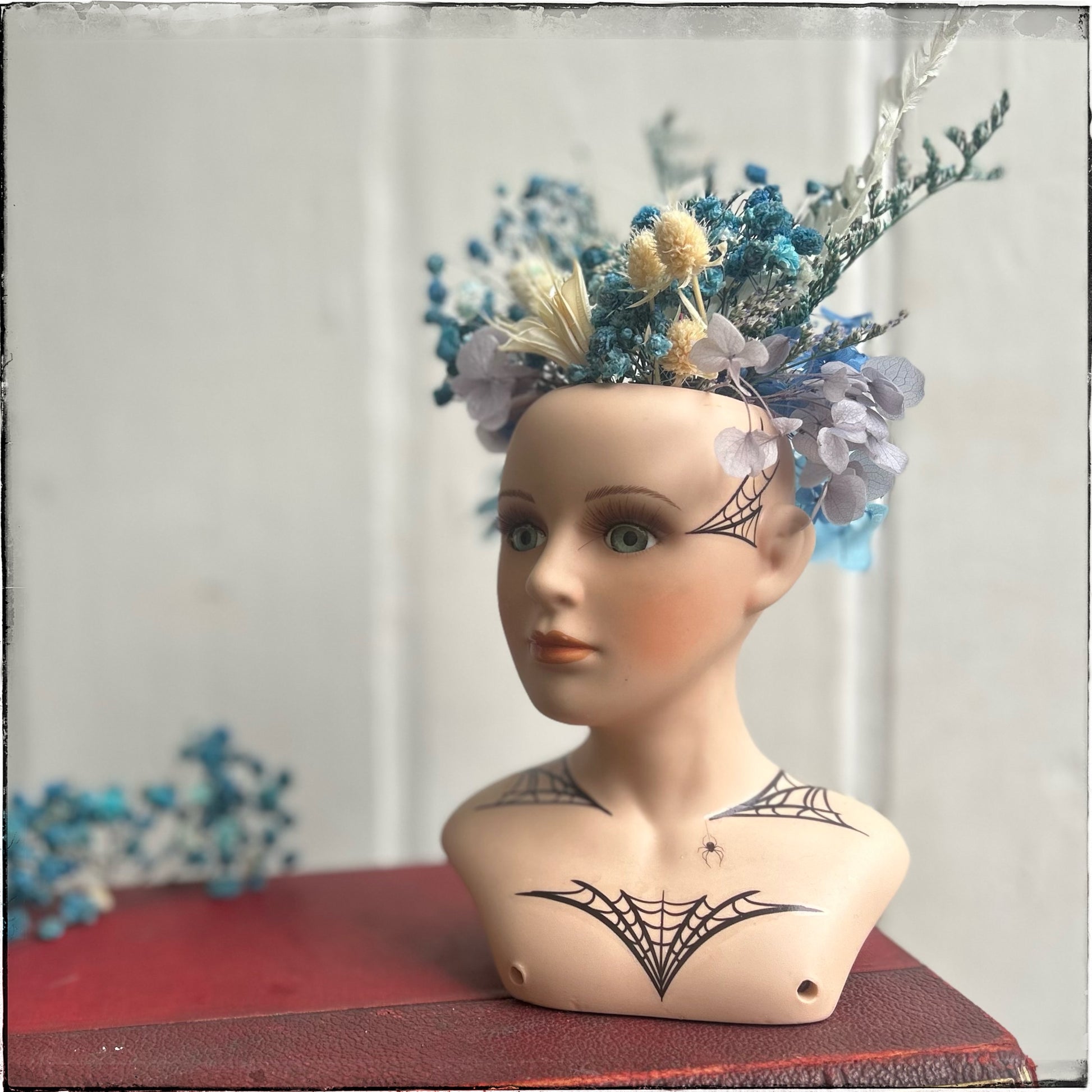 Recycled vintage porcelain doll head with tattoo decoration and dried floral hair arrangement (the flowers are not set to allow them to be changed in the future if damaged or a new colour desired).