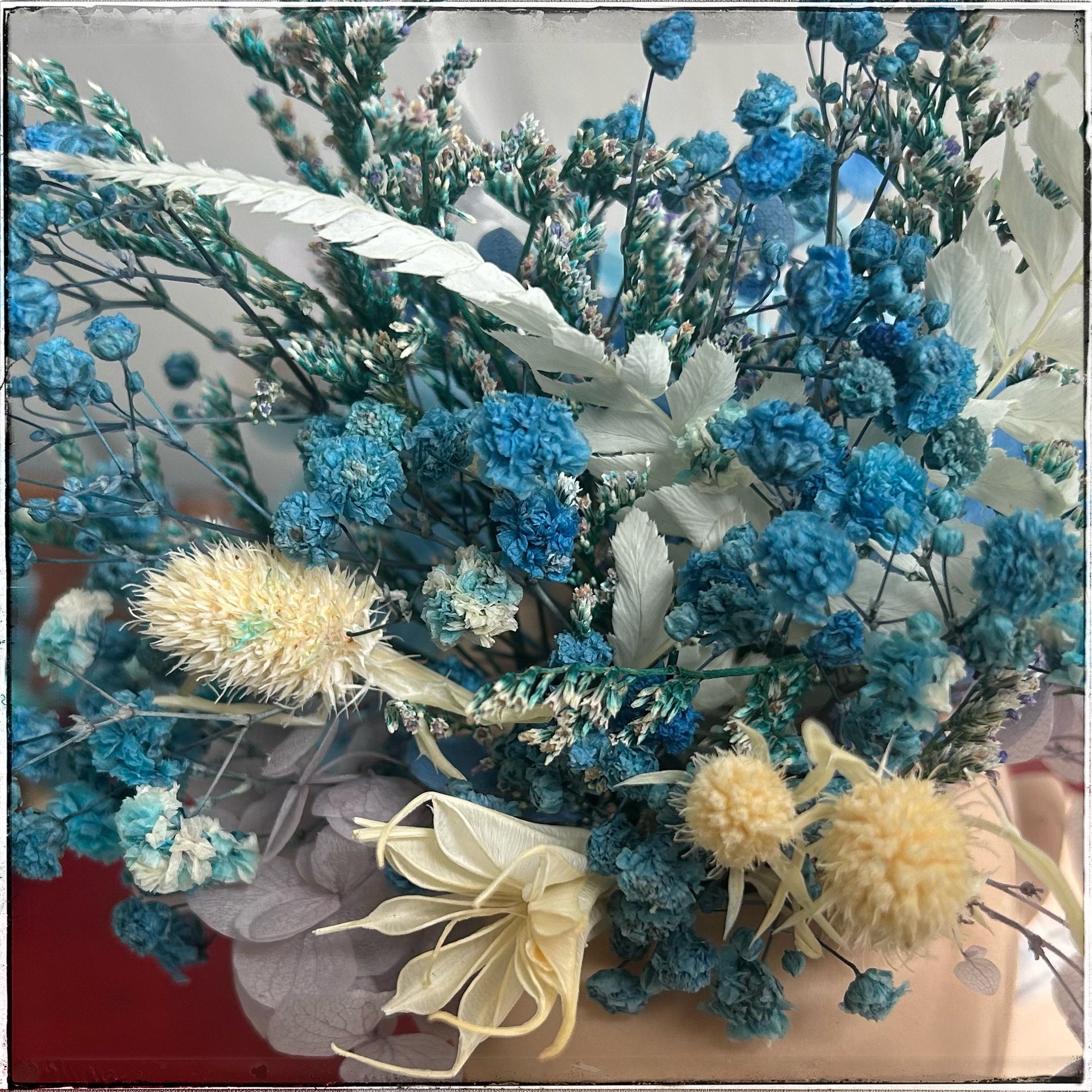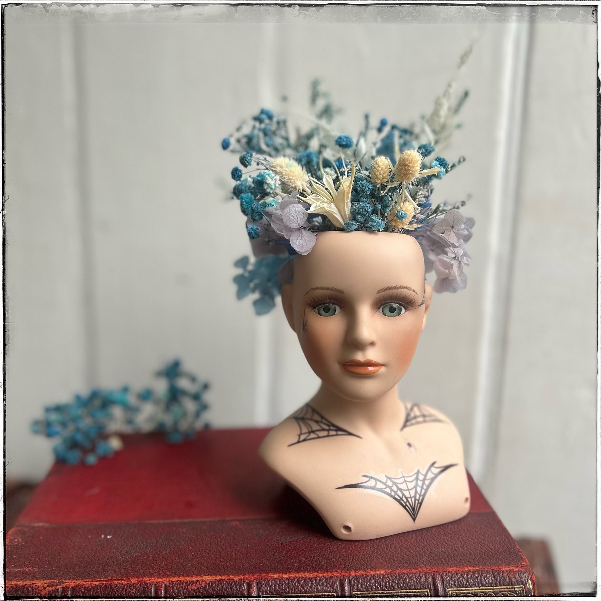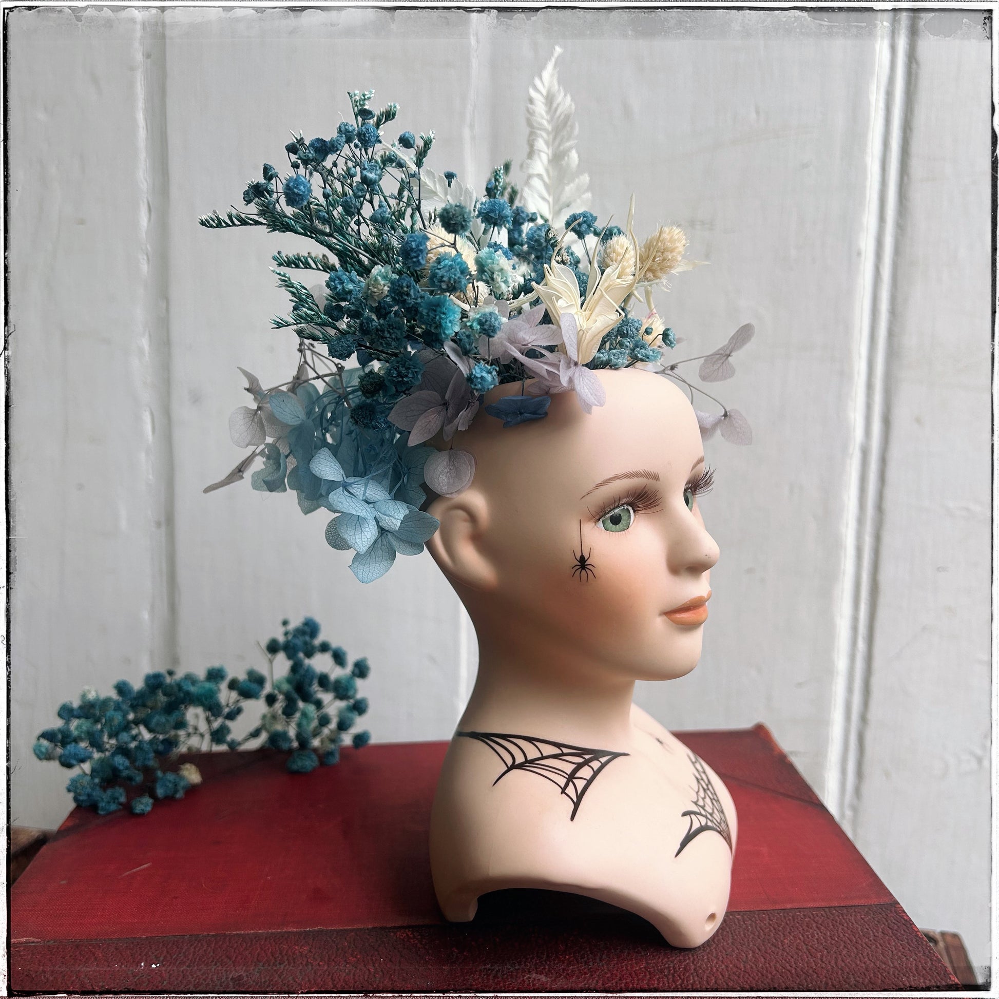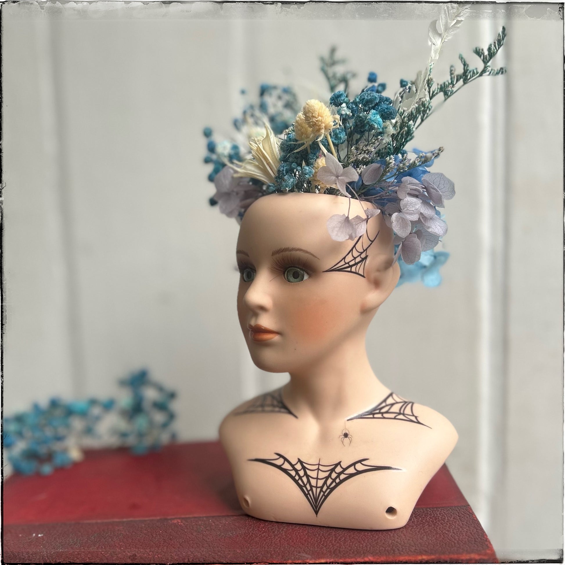 Recycled vintage porcelain doll head with tattoo decoration and dried floral hair arrangement (the flowers are not set to allow them to be changed in the future if damaged or a new colour desired).