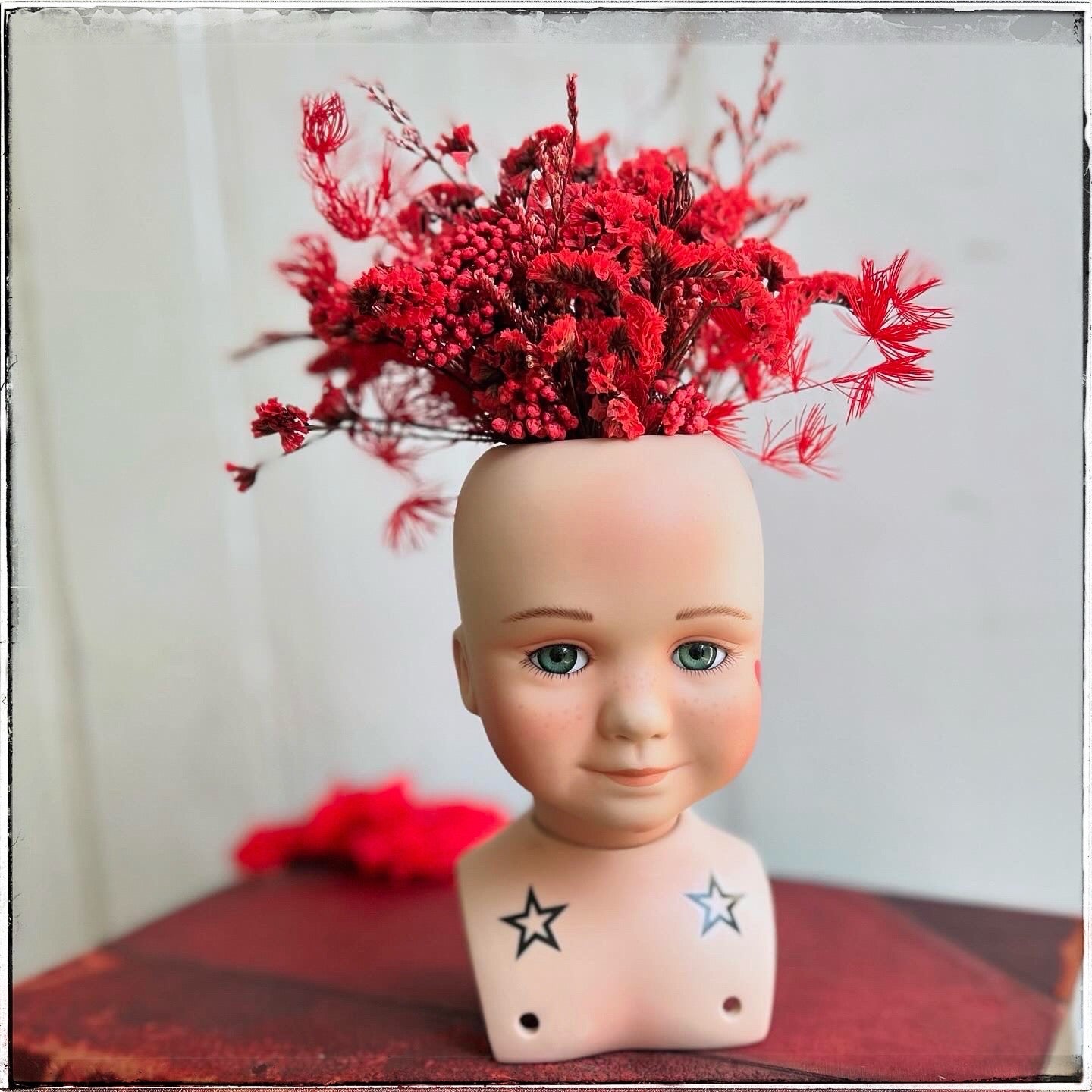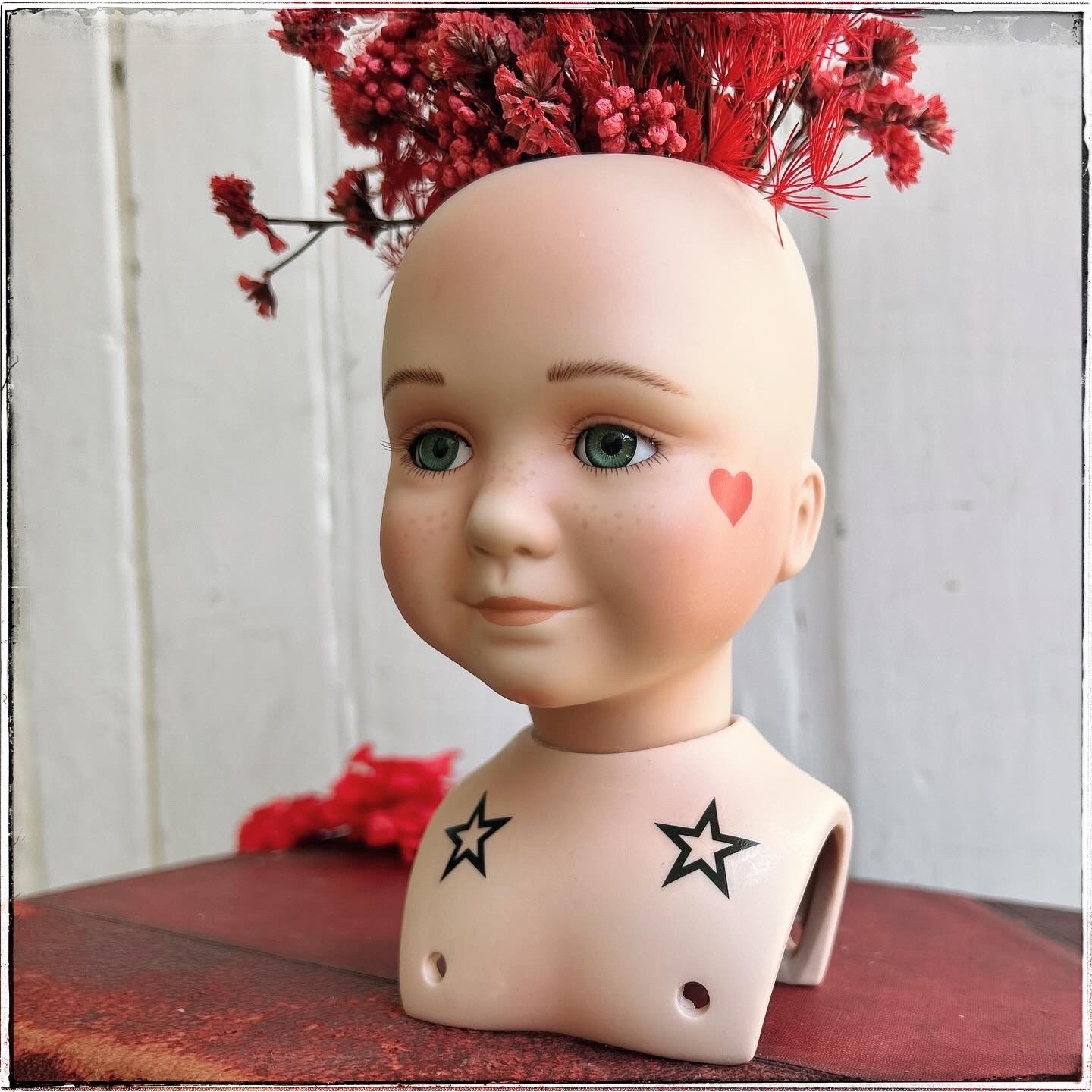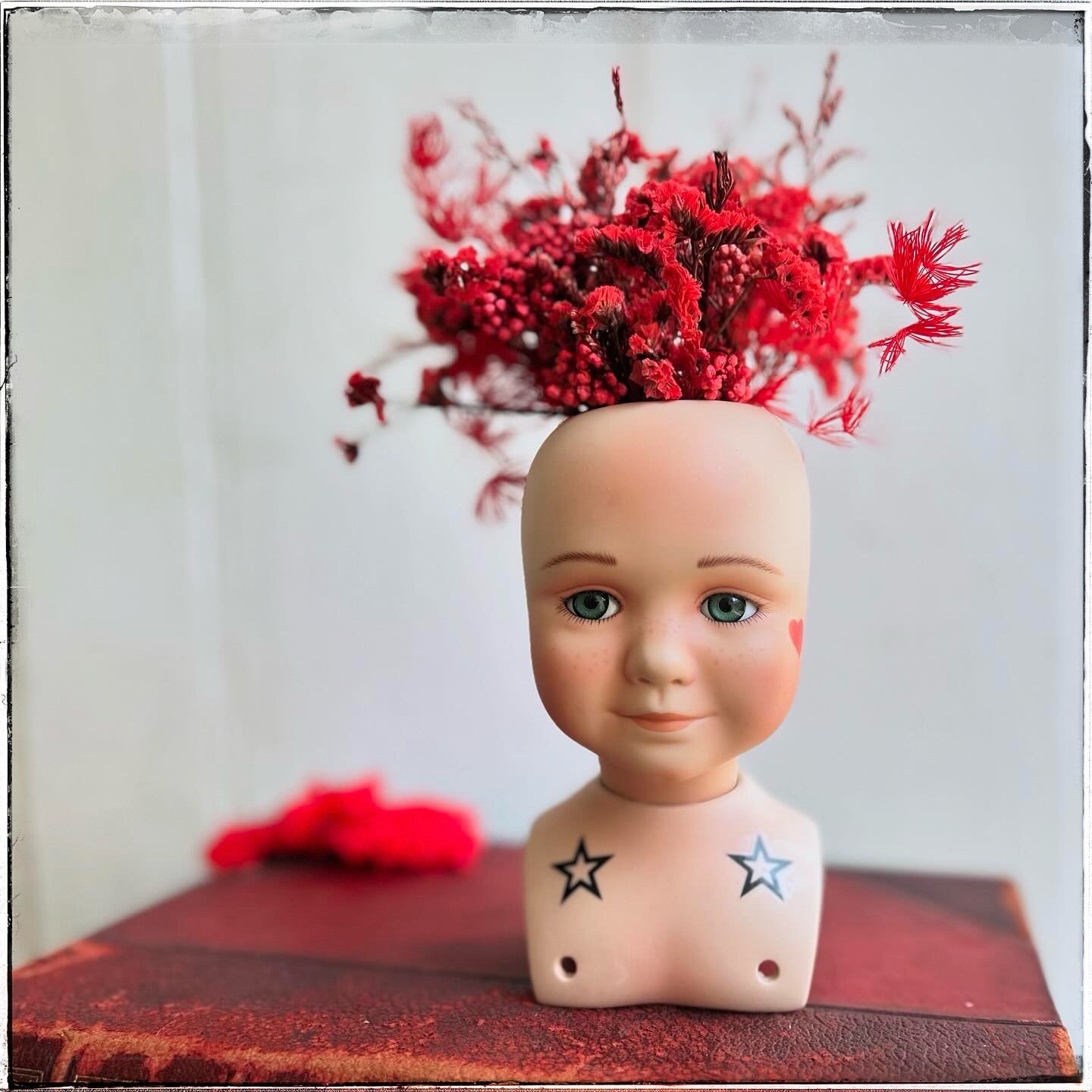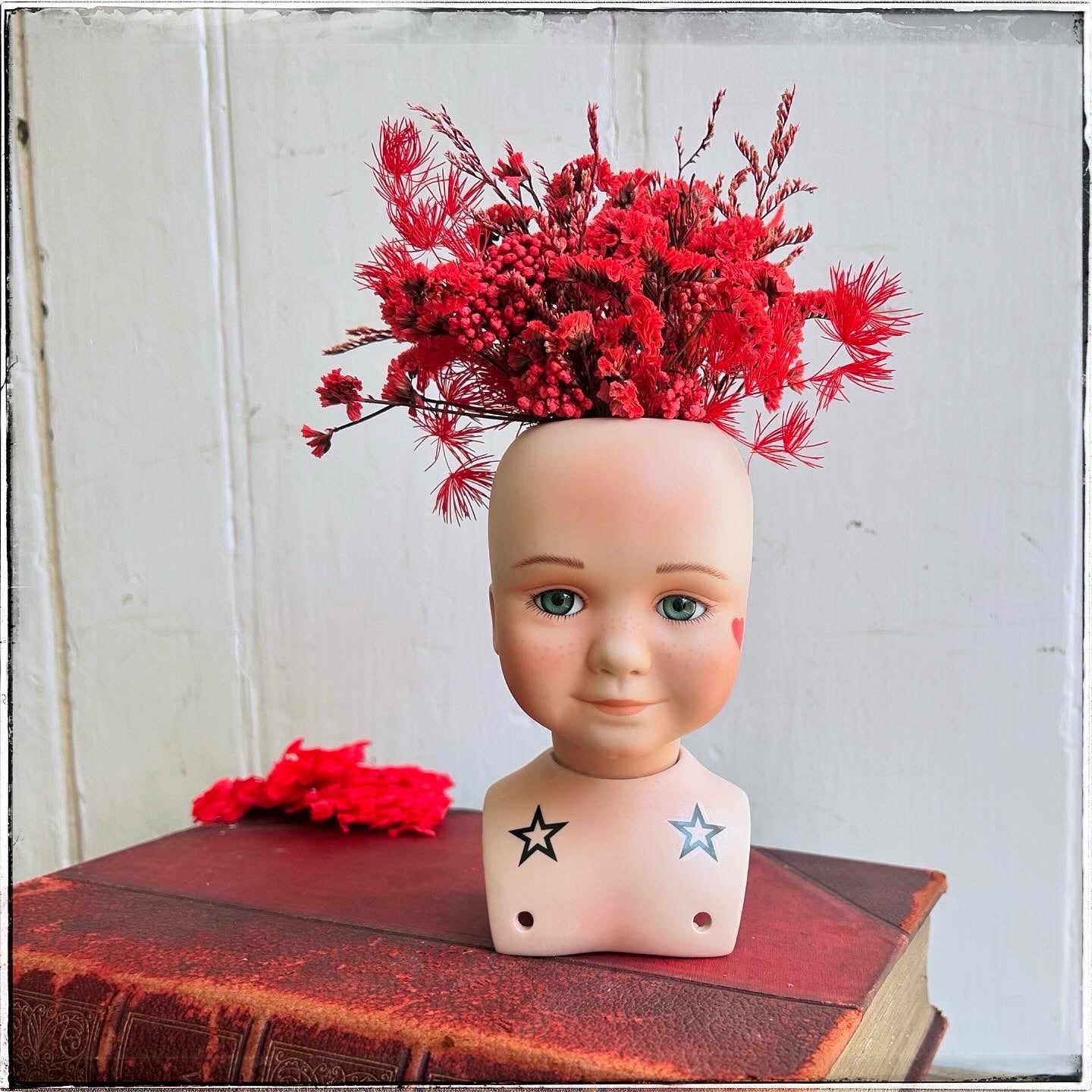 Recycled vintage porcelain doll head with tattoo decoration and dried floral hair arrangement (the flowers are not set to allow them to be changed in the future if damaged or a new colour desired).