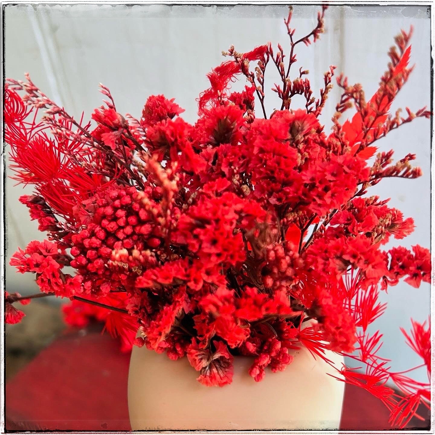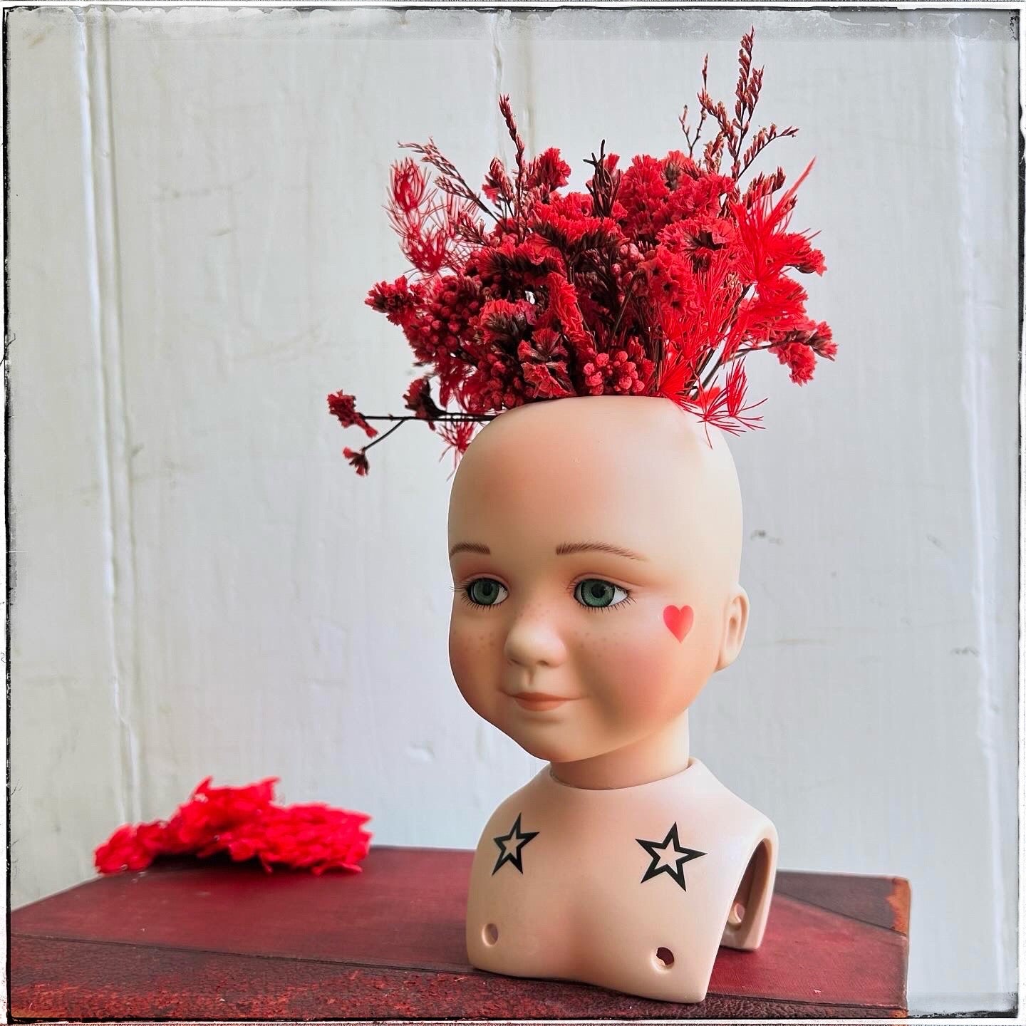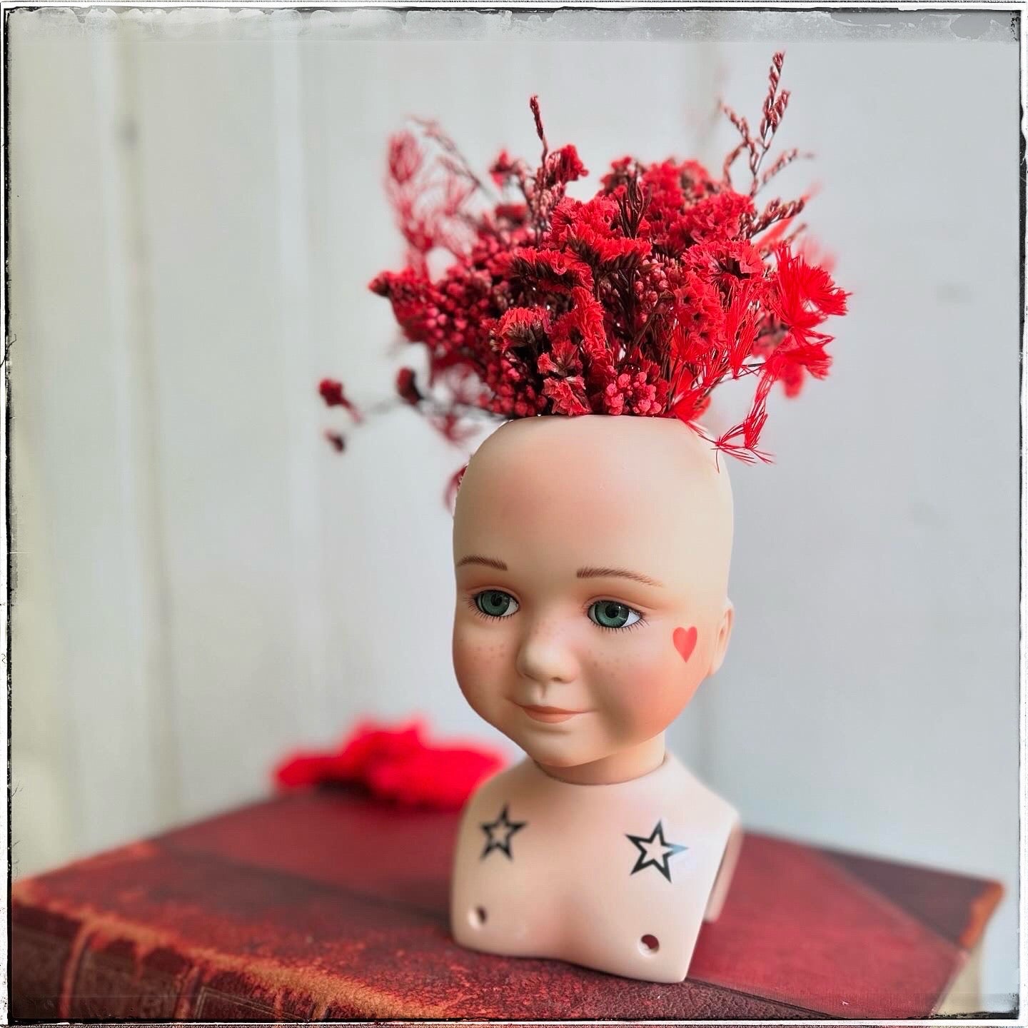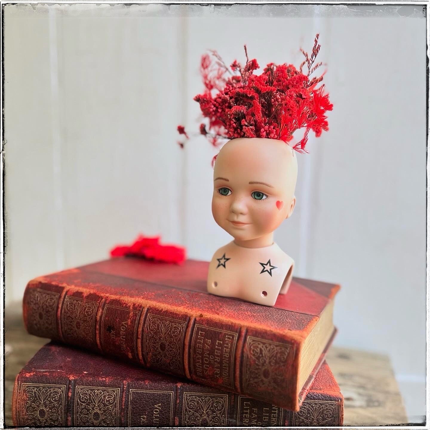 Recycled vintage porcelain doll head with tattoo decoration and dried floral hair arrangement (the flowers are not set to allow them to be changed in the future if damaged or a new colour desired).