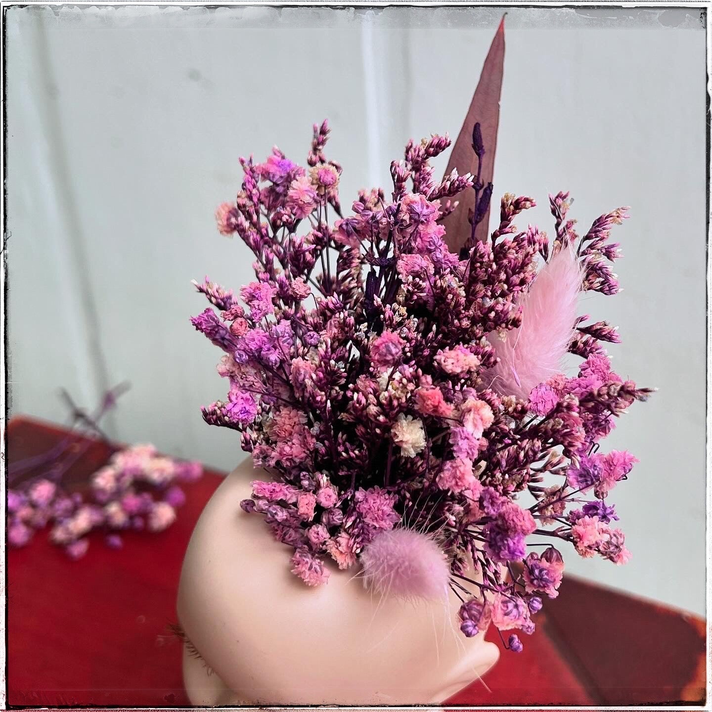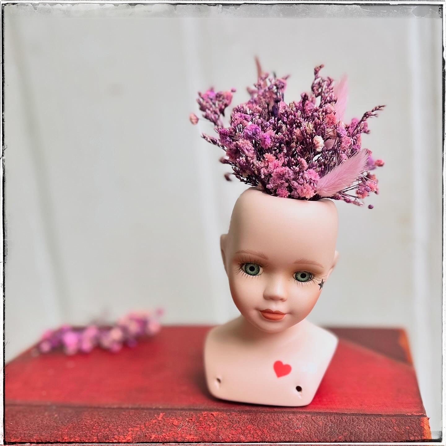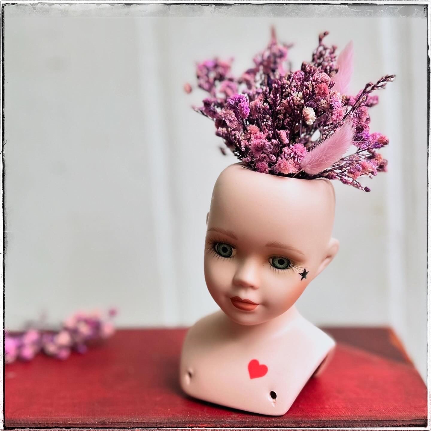 Recycled vintage porcelain doll head with tattoo decoration and dried floral hair arrangement (the flowers are not set to allow them to be changed in the future if damaged or a new colour desired).