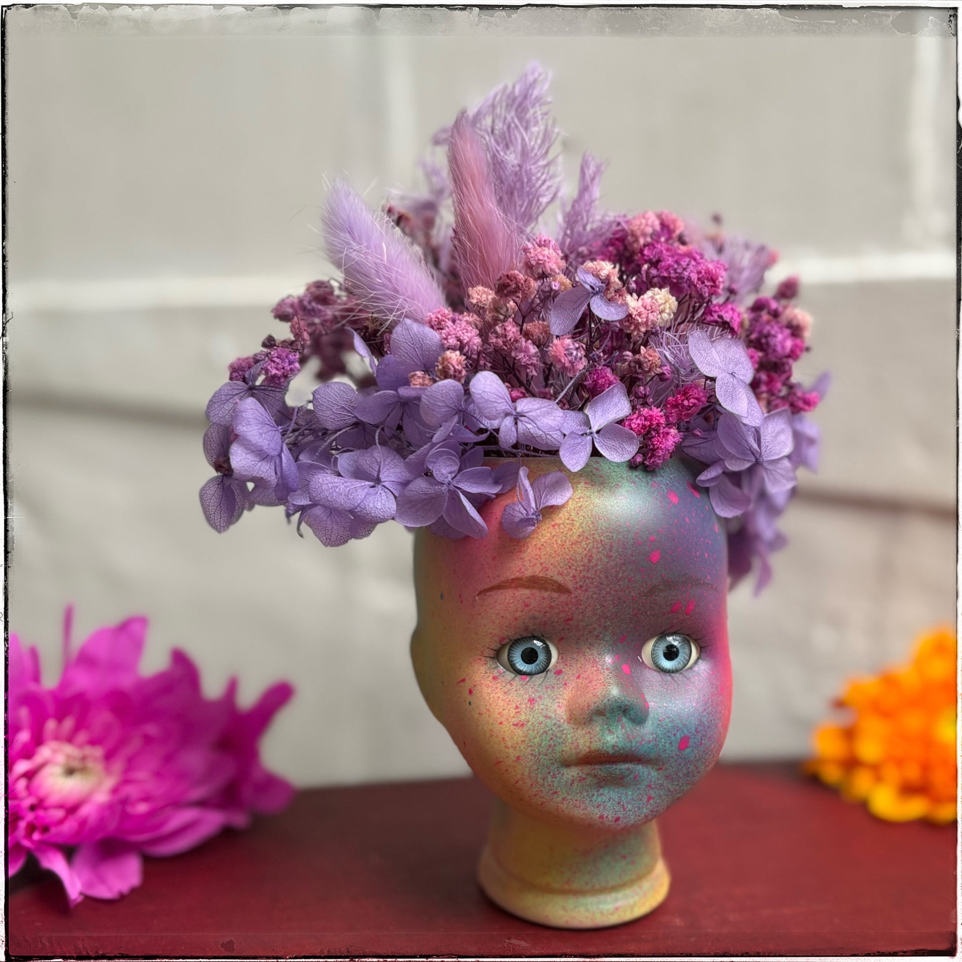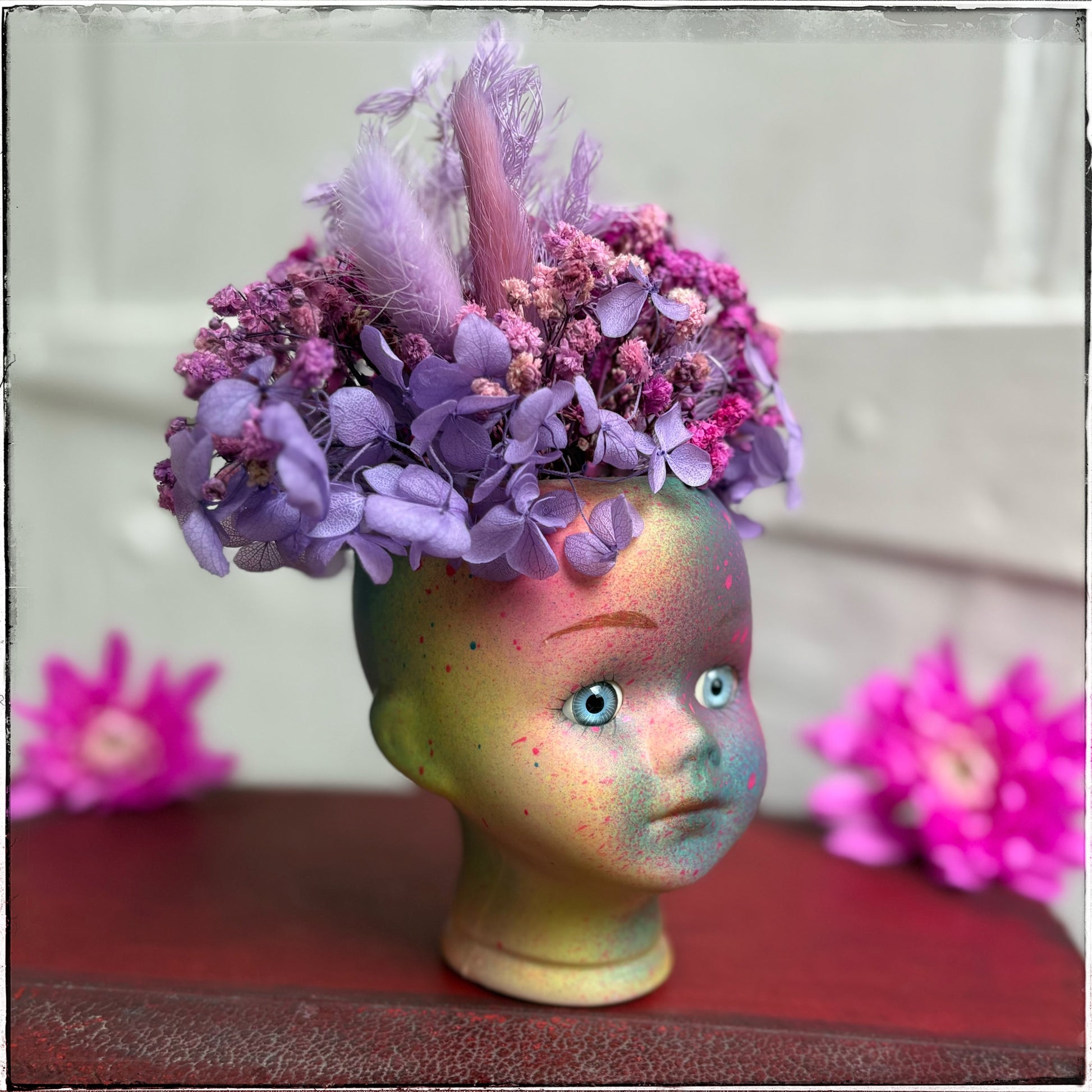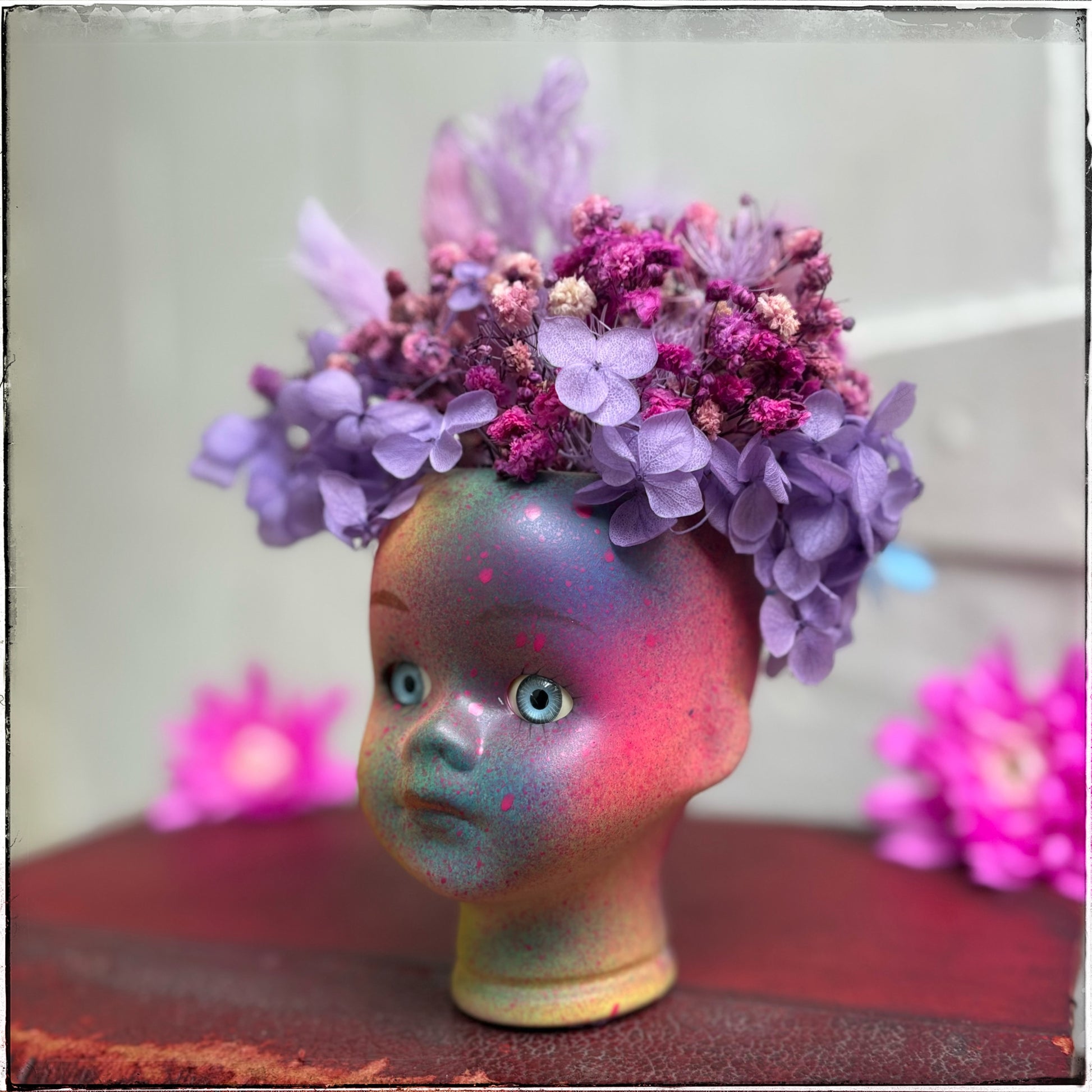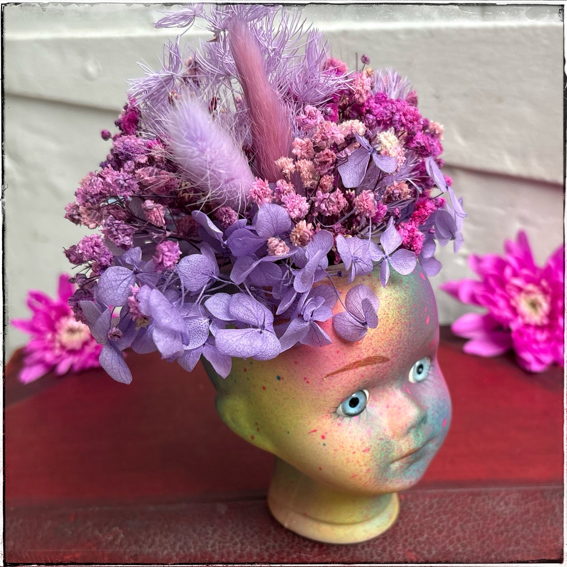 Recycled vintage porcelain doll head with spray painted decoration and dried floral hair arrangement (the flowers are not set to allow them to be changed in the future if damaged or a new colour desired).