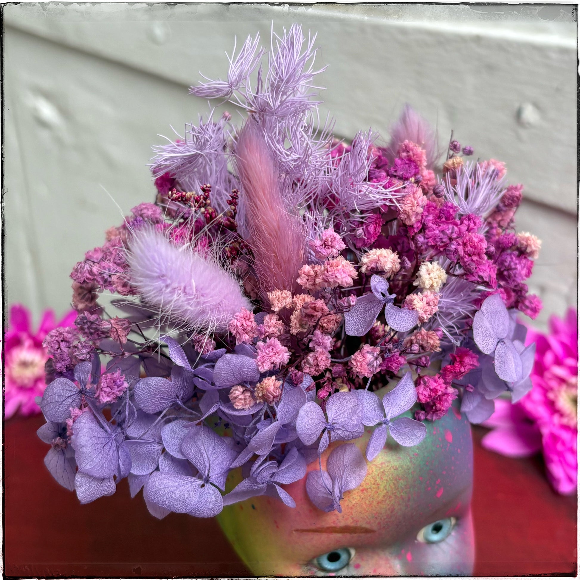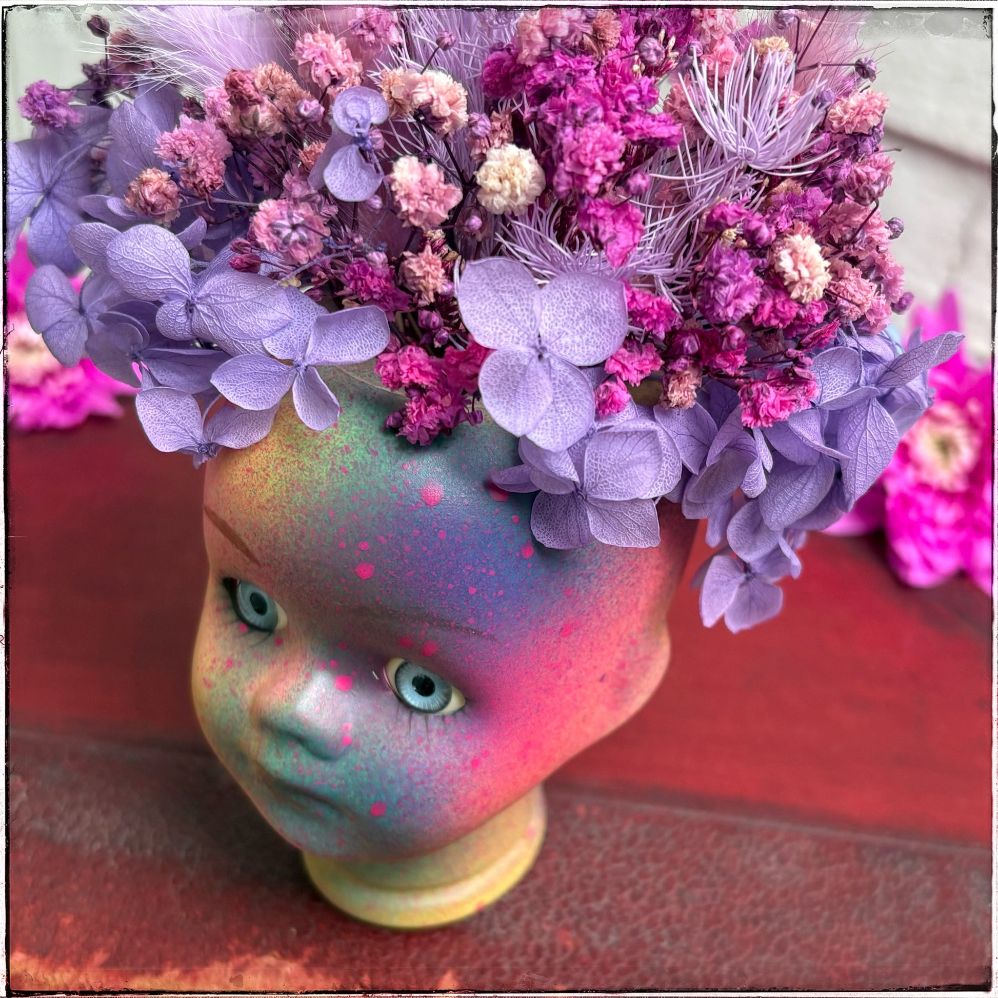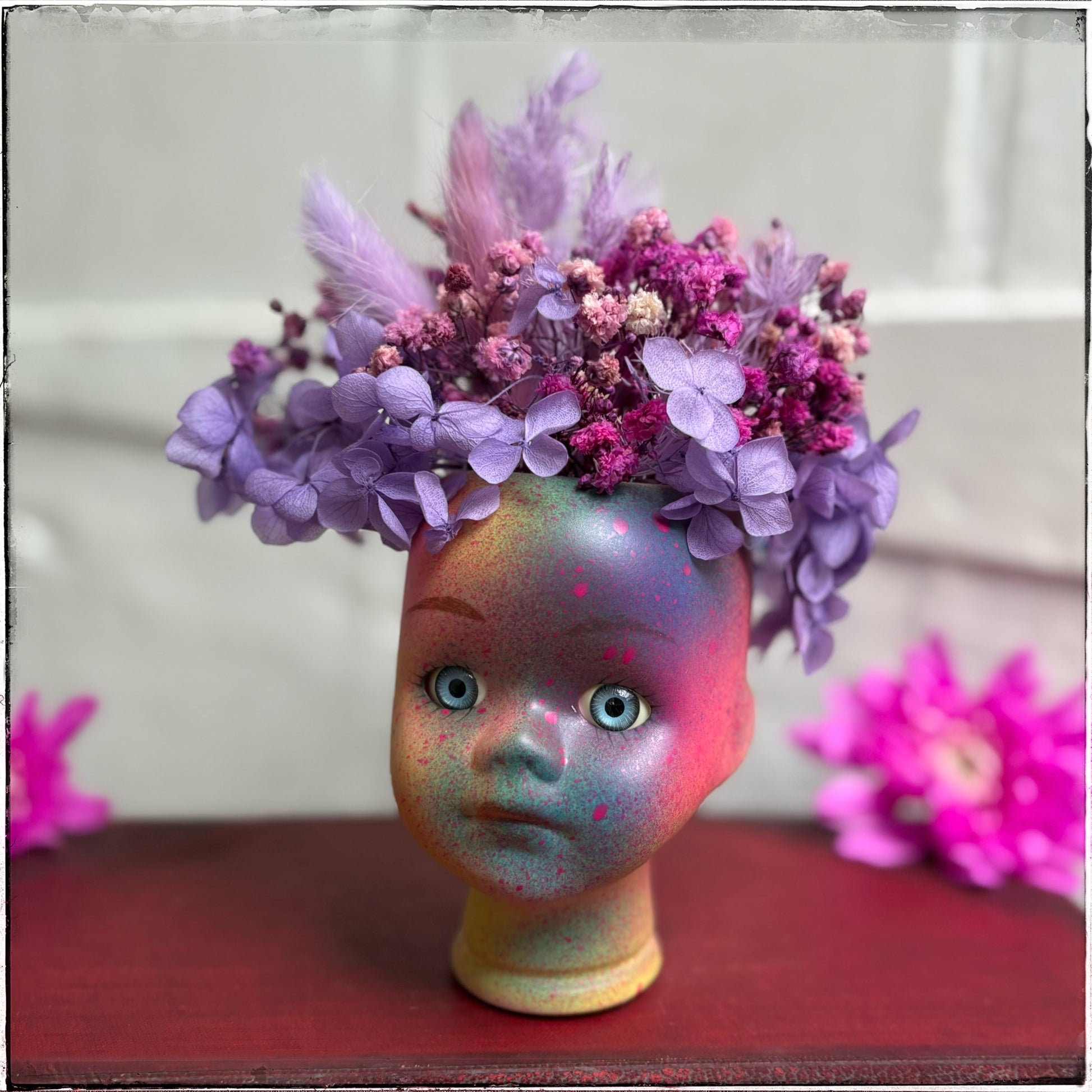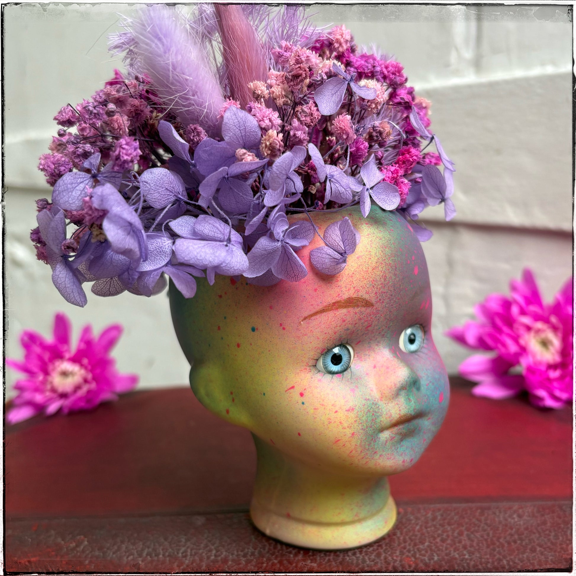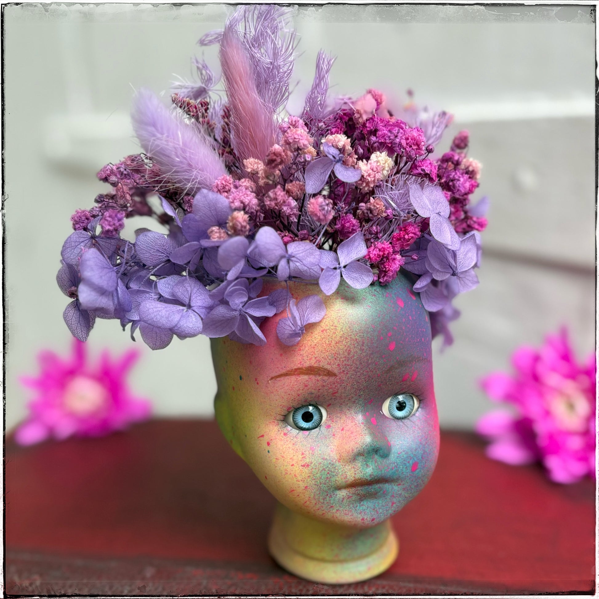 Recycled vintage porcelain doll head with spray painted decoration and dried floral hair arrangement (the flowers are not set to allow them to be changed in the future if damaged or a new colour desired).