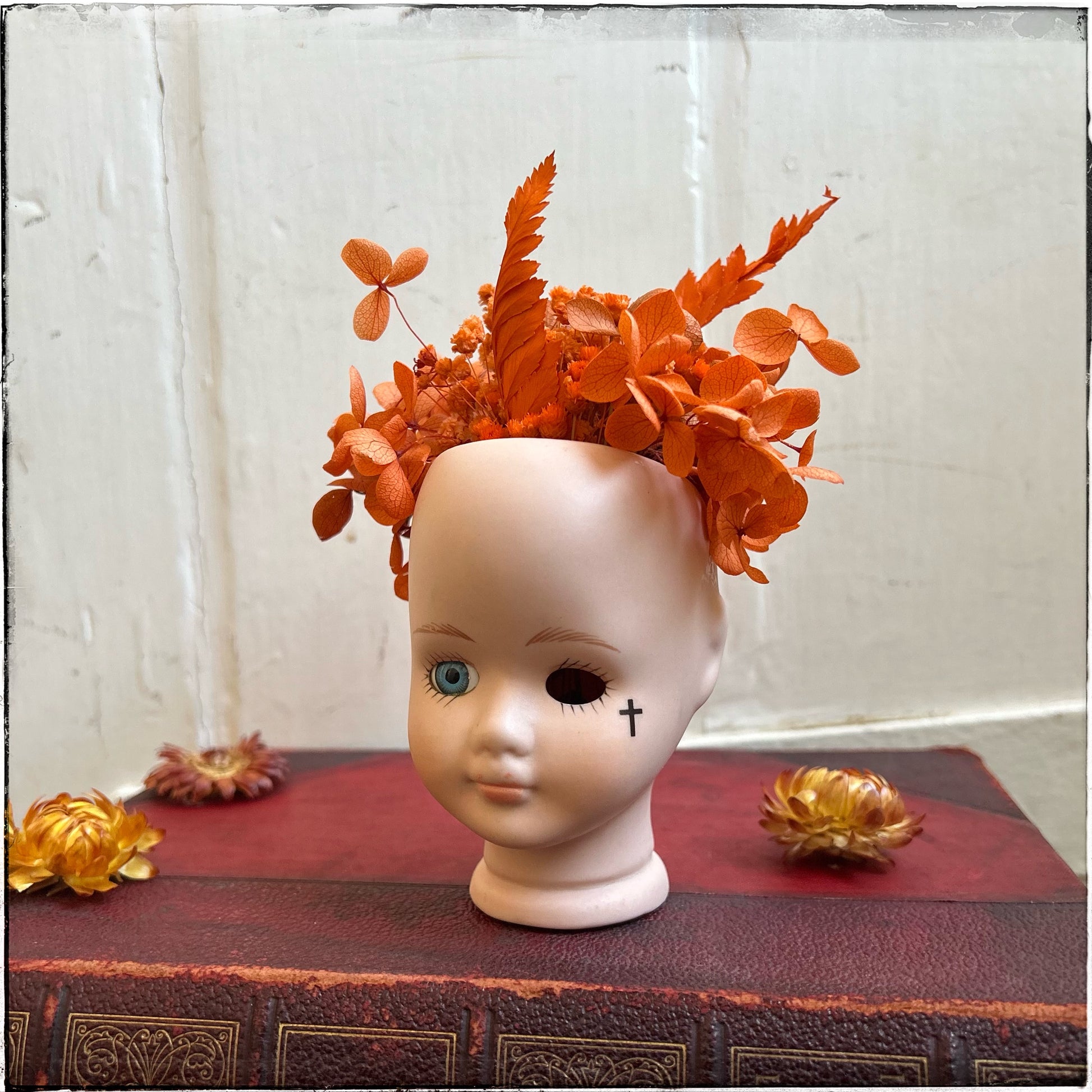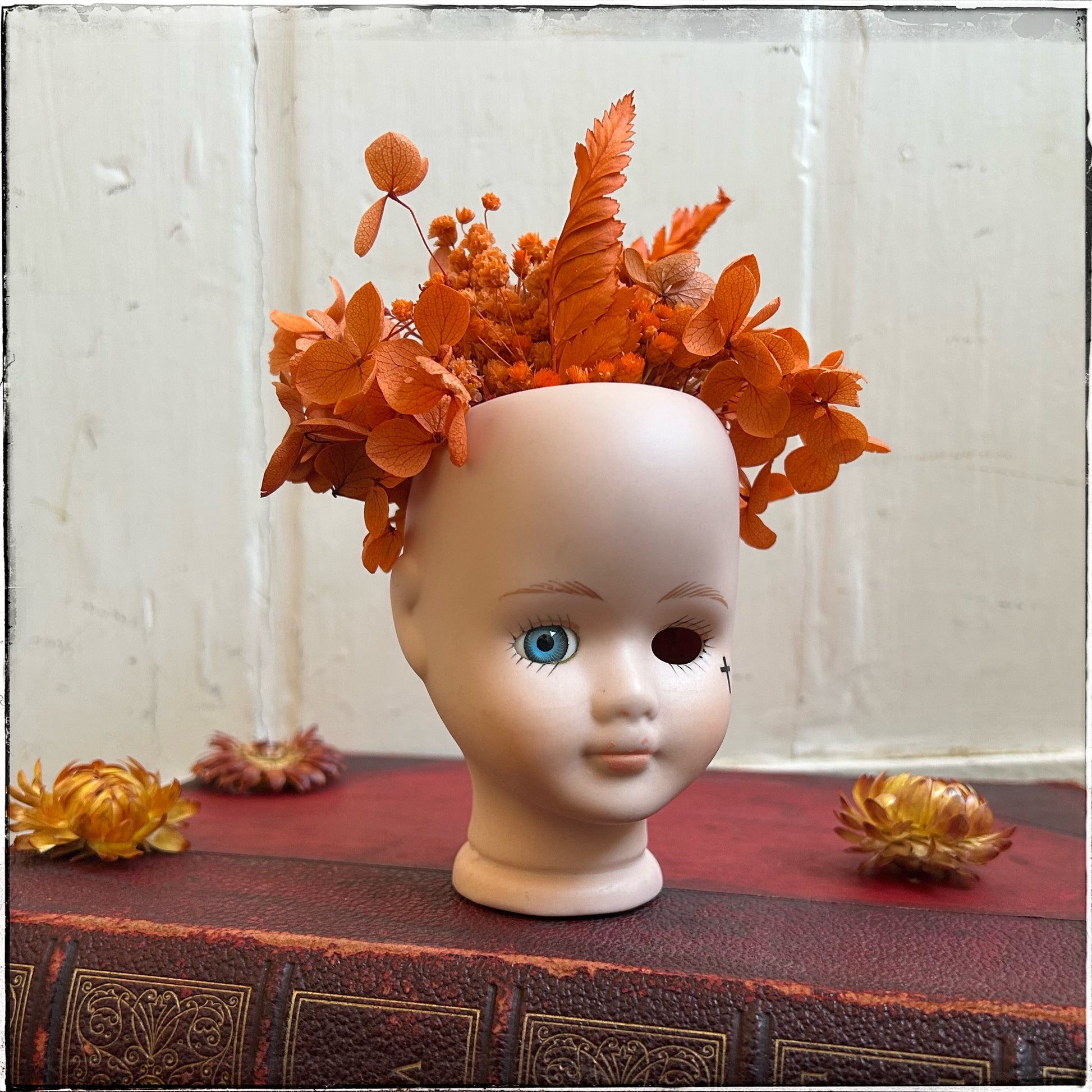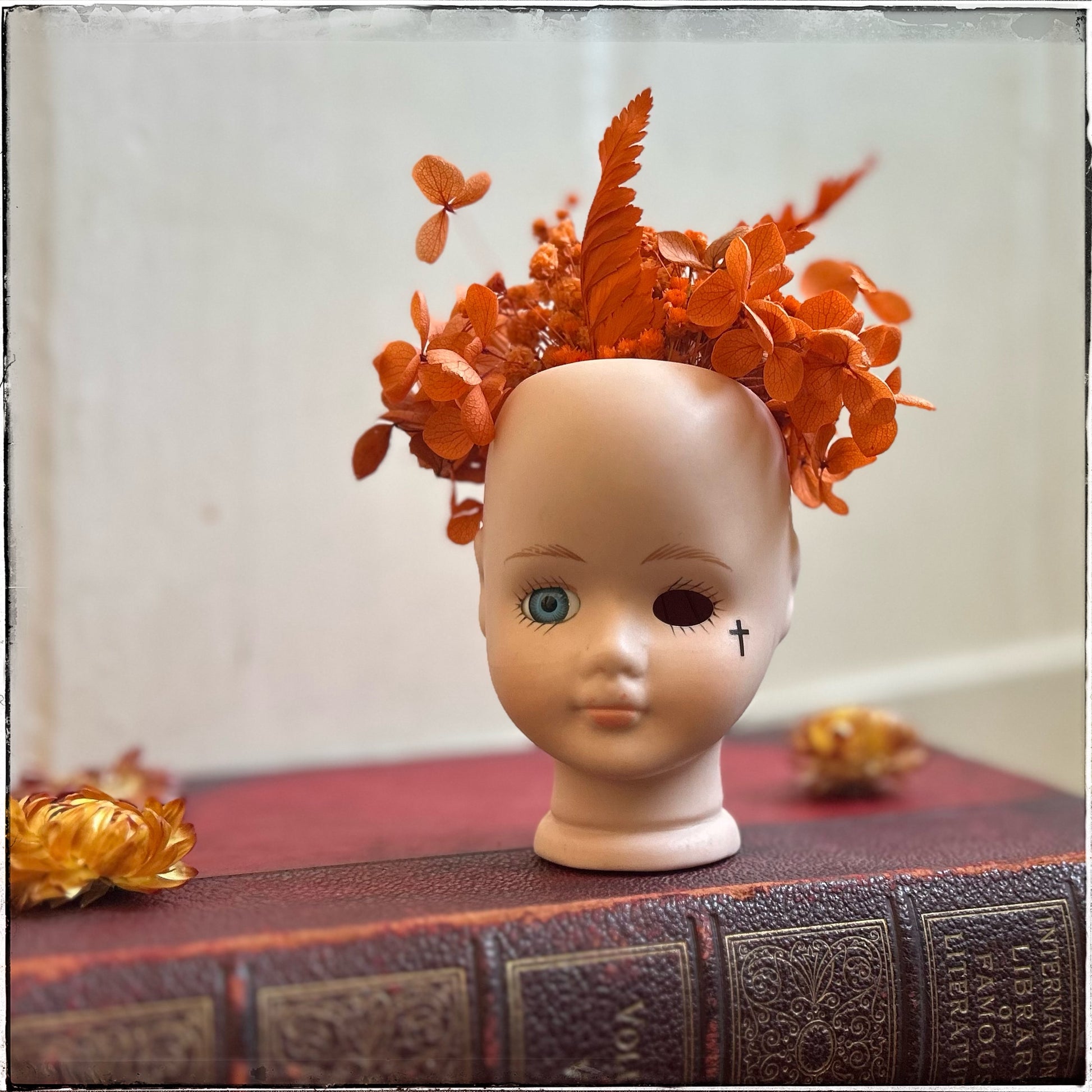 Recycled vintage porcelain doll head with tattoo decoration and dried floral hair arrangement (the flowers are not set to allow them to be changed in the future if damaged or a new colour desired).