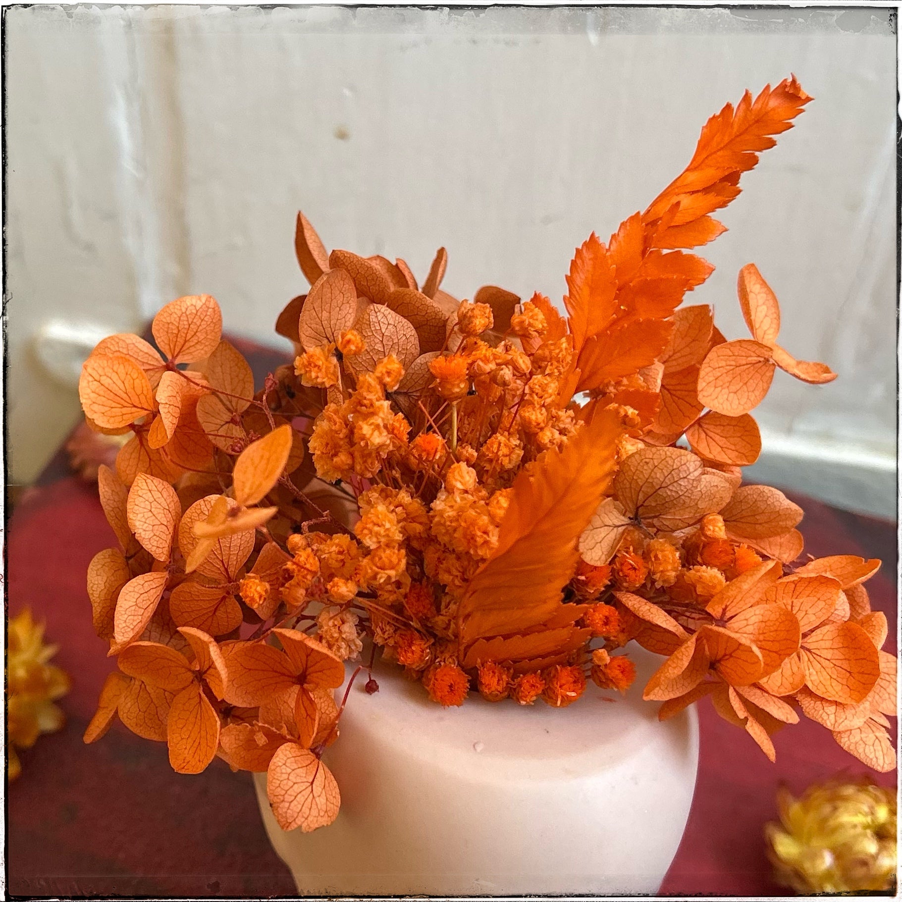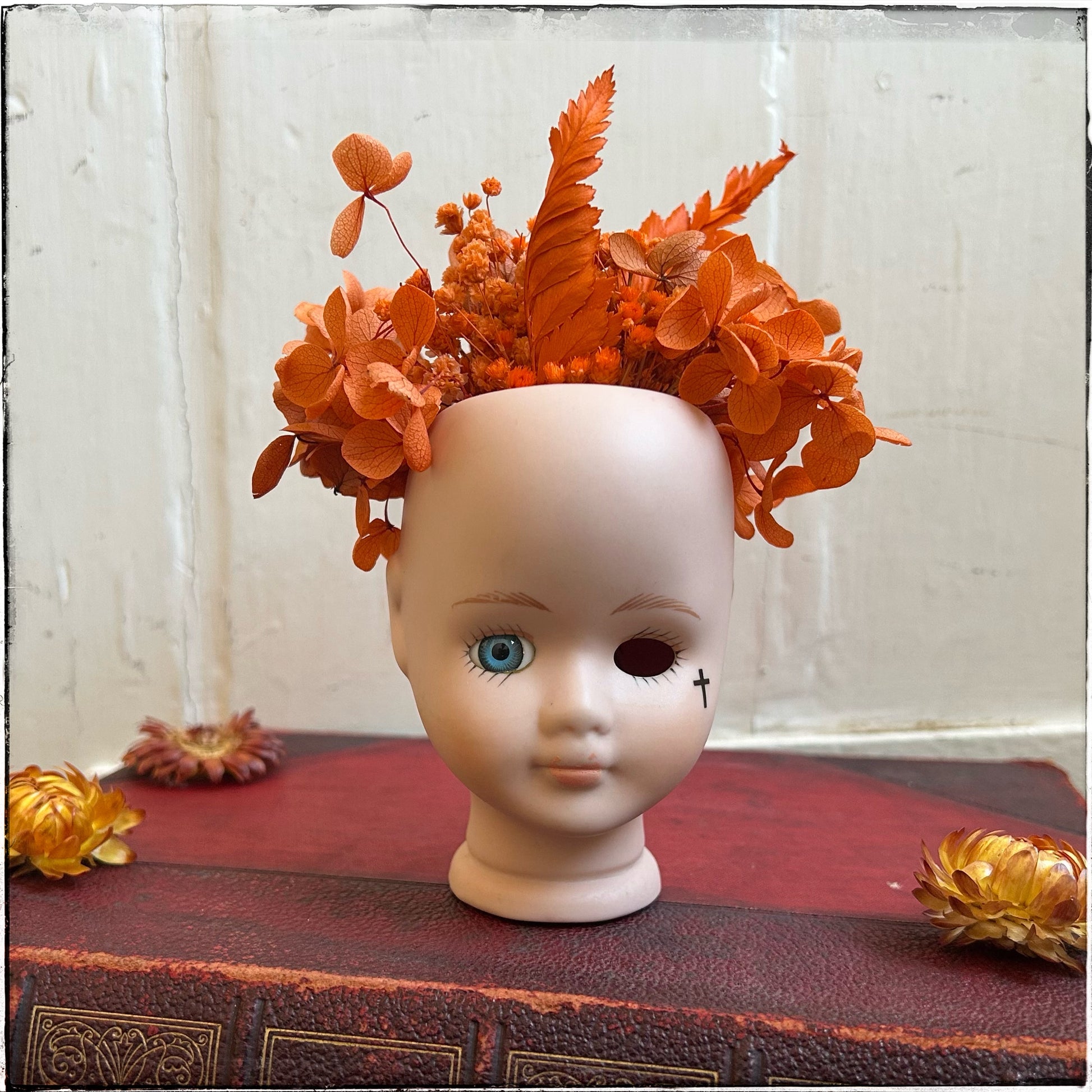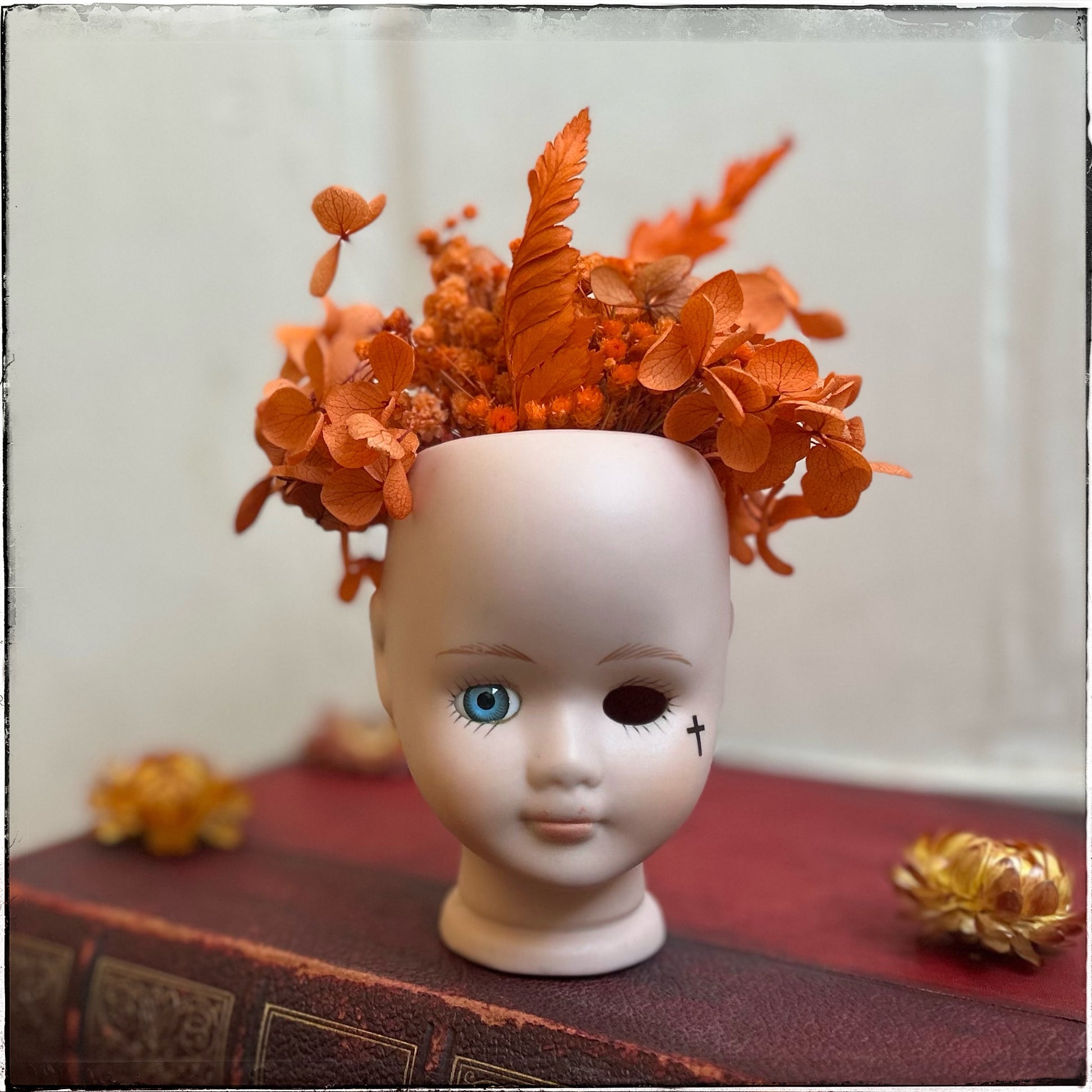 Recycled vintage porcelain doll head with tattoo decoration and dried floral hair arrangement (the flowers are not set to allow them to be changed in the future if damaged or a new colour desired).