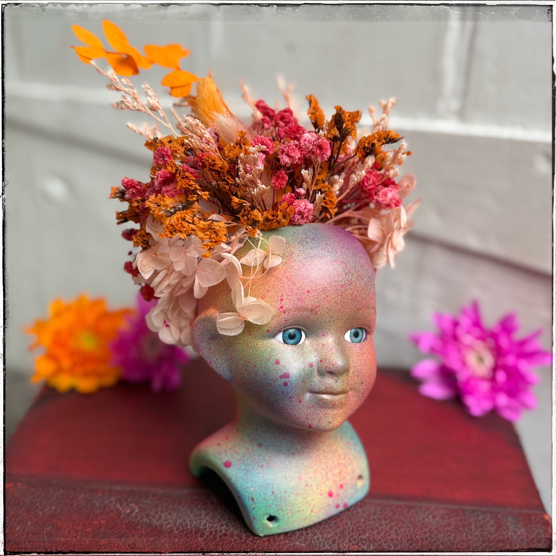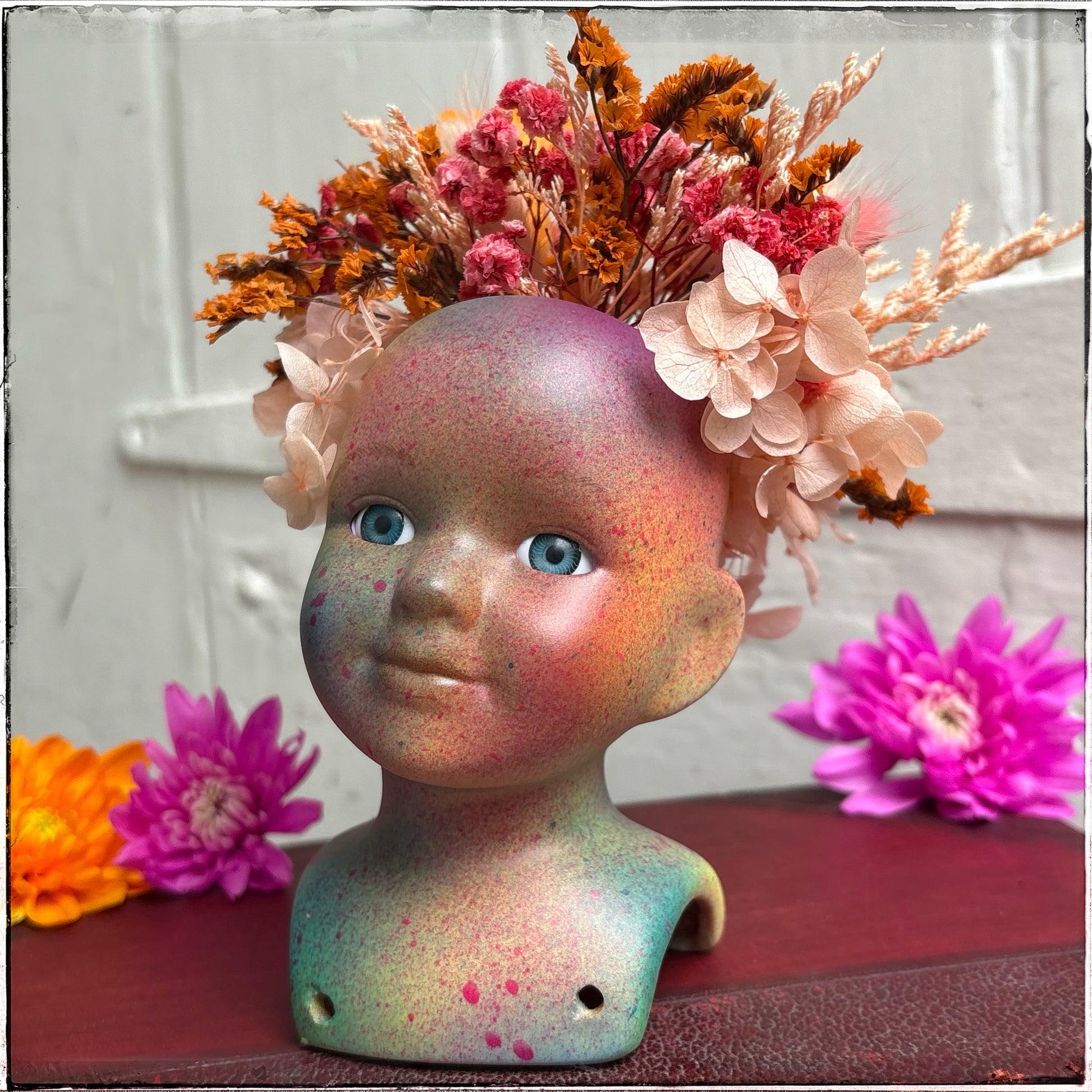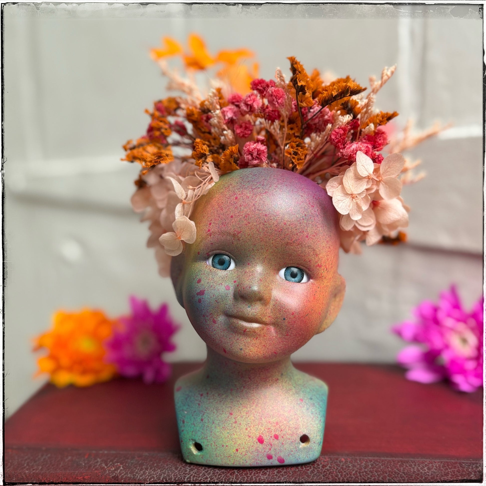 Recycled vintage porcelain doll head with spray painted decoration and dried floral hair arrangement (the flowers are not set to allow them to be changed in the future if damaged or a new colour desired).