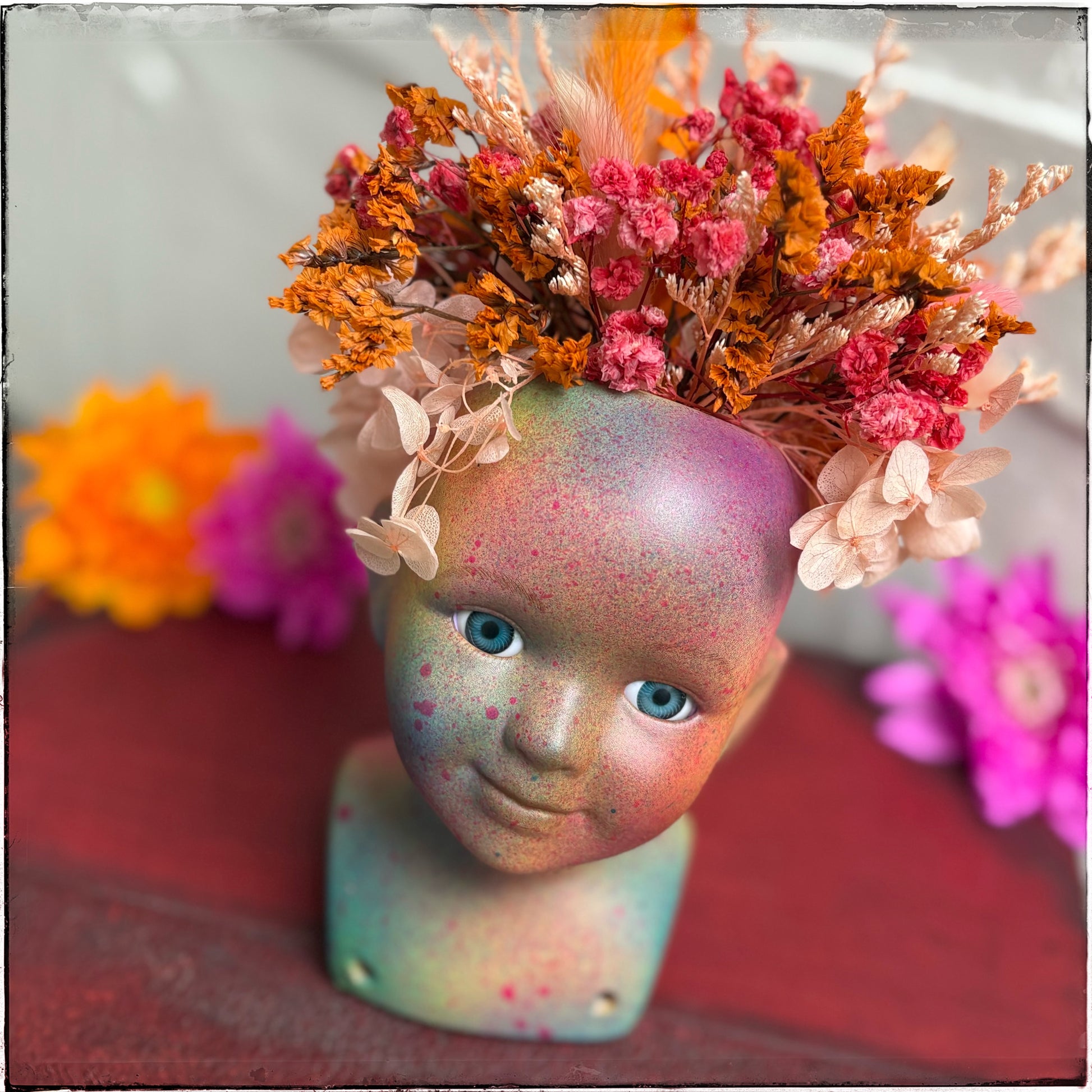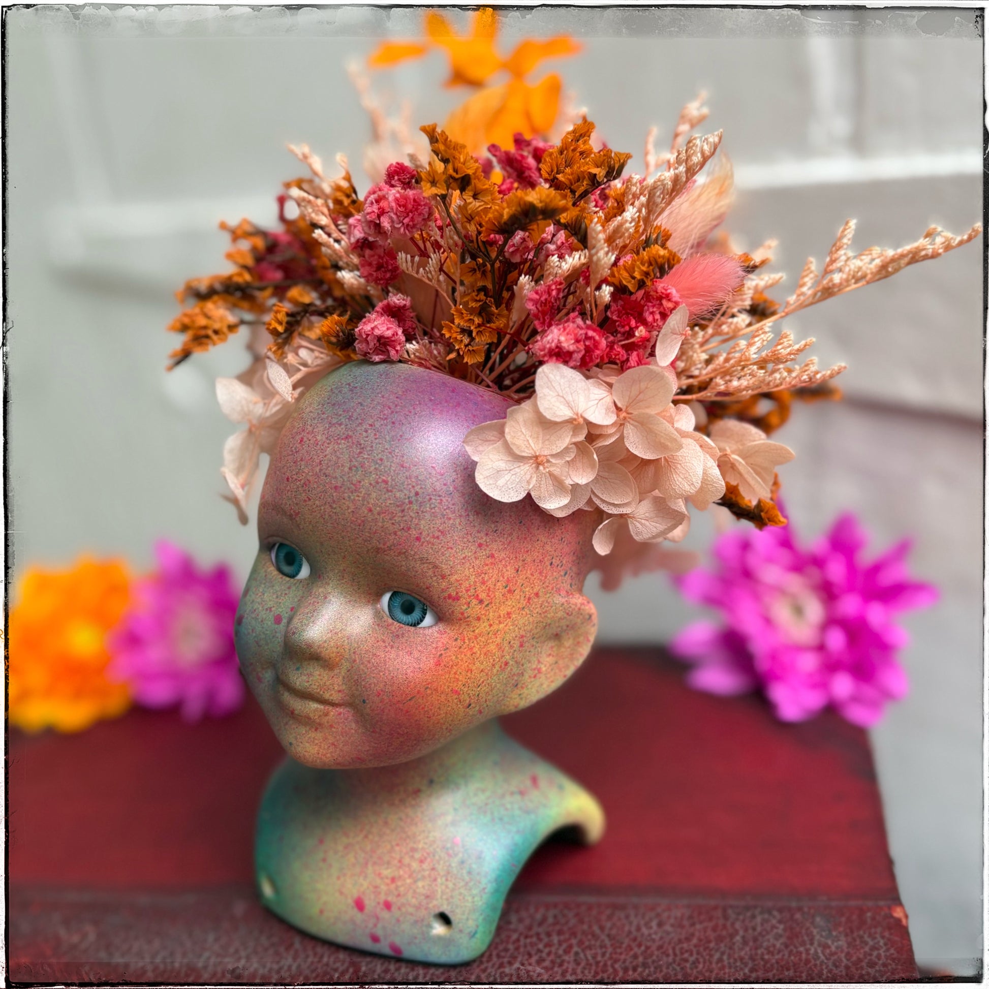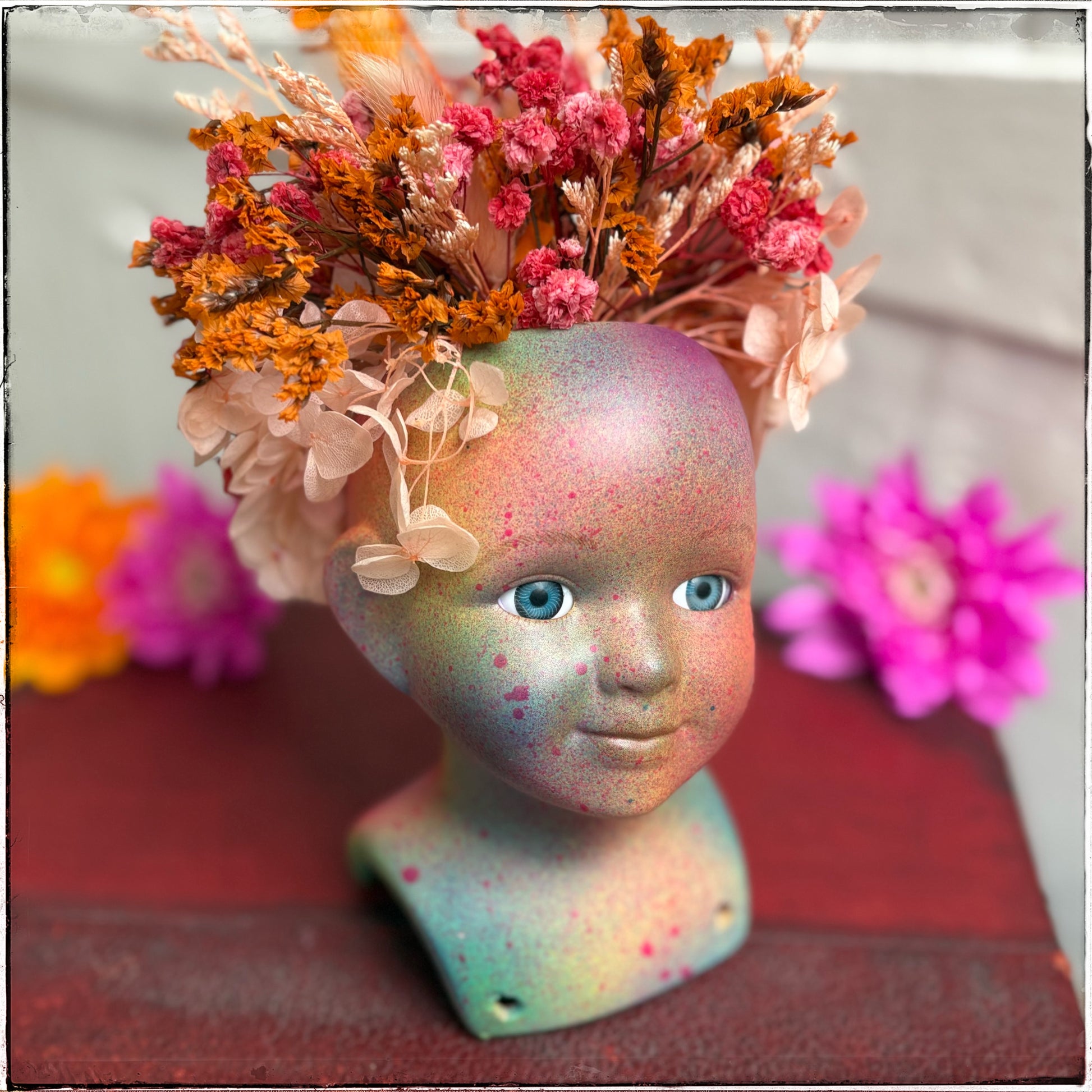 Recycled vintage porcelain doll head with spray painted decoration and dried floral hair arrangement (the flowers are not set to allow them to be changed in the future if damaged or a new colour desired).