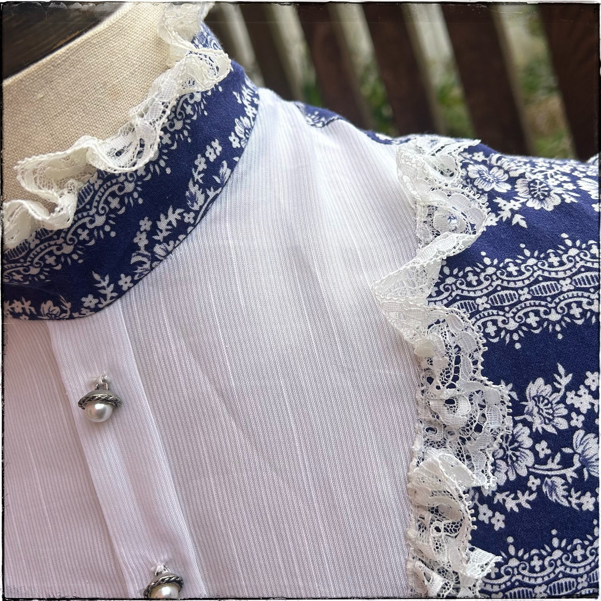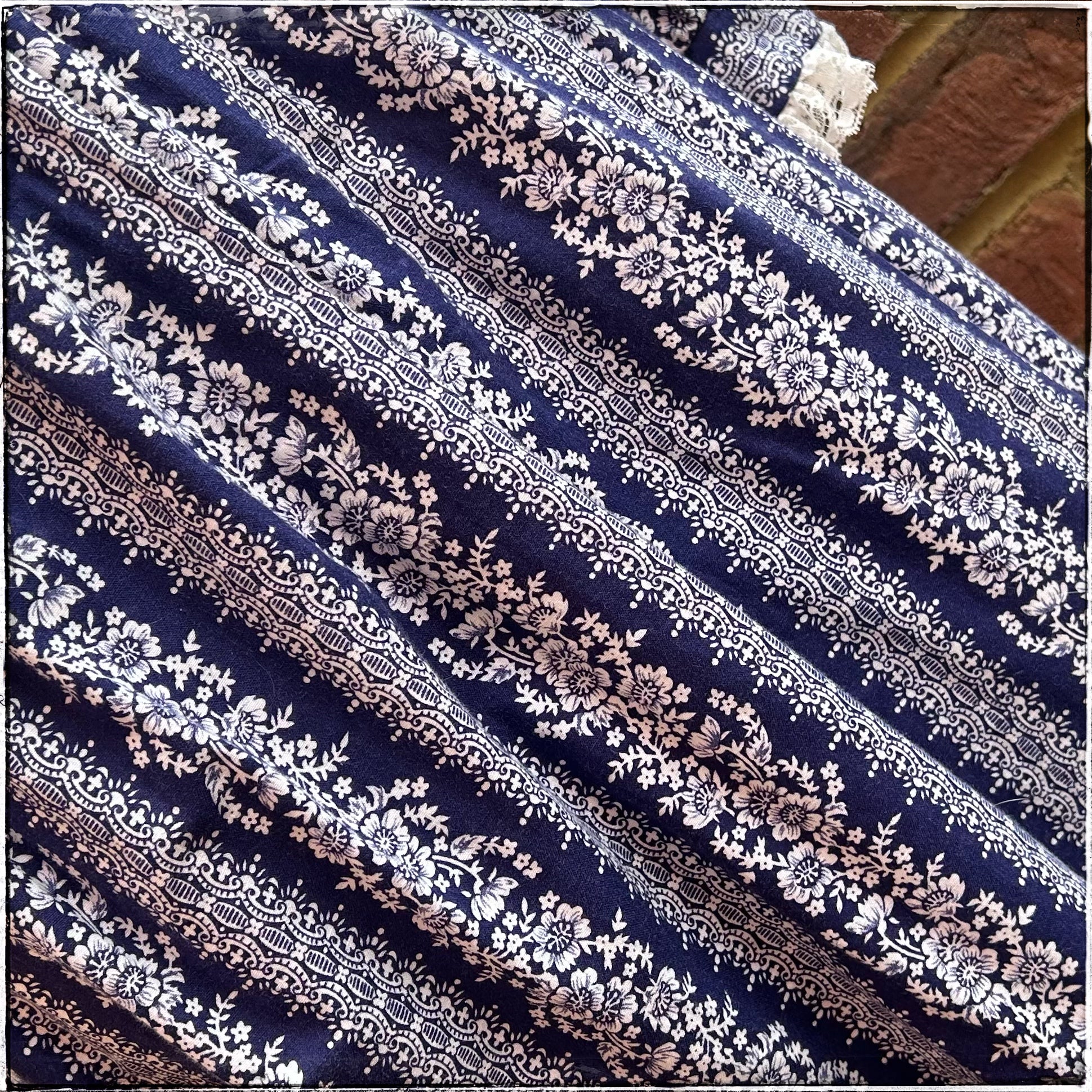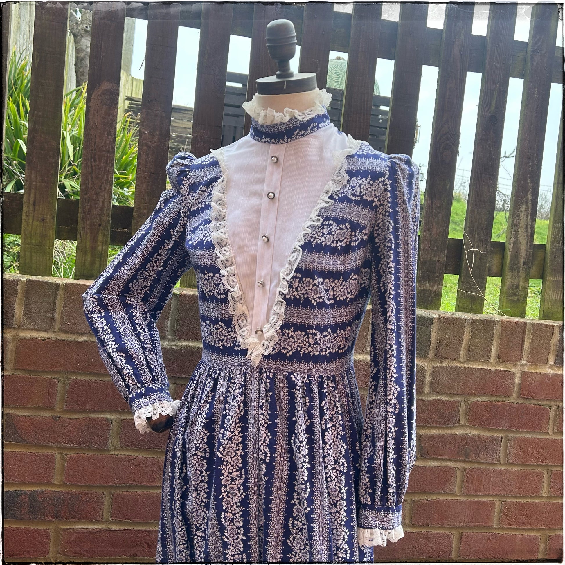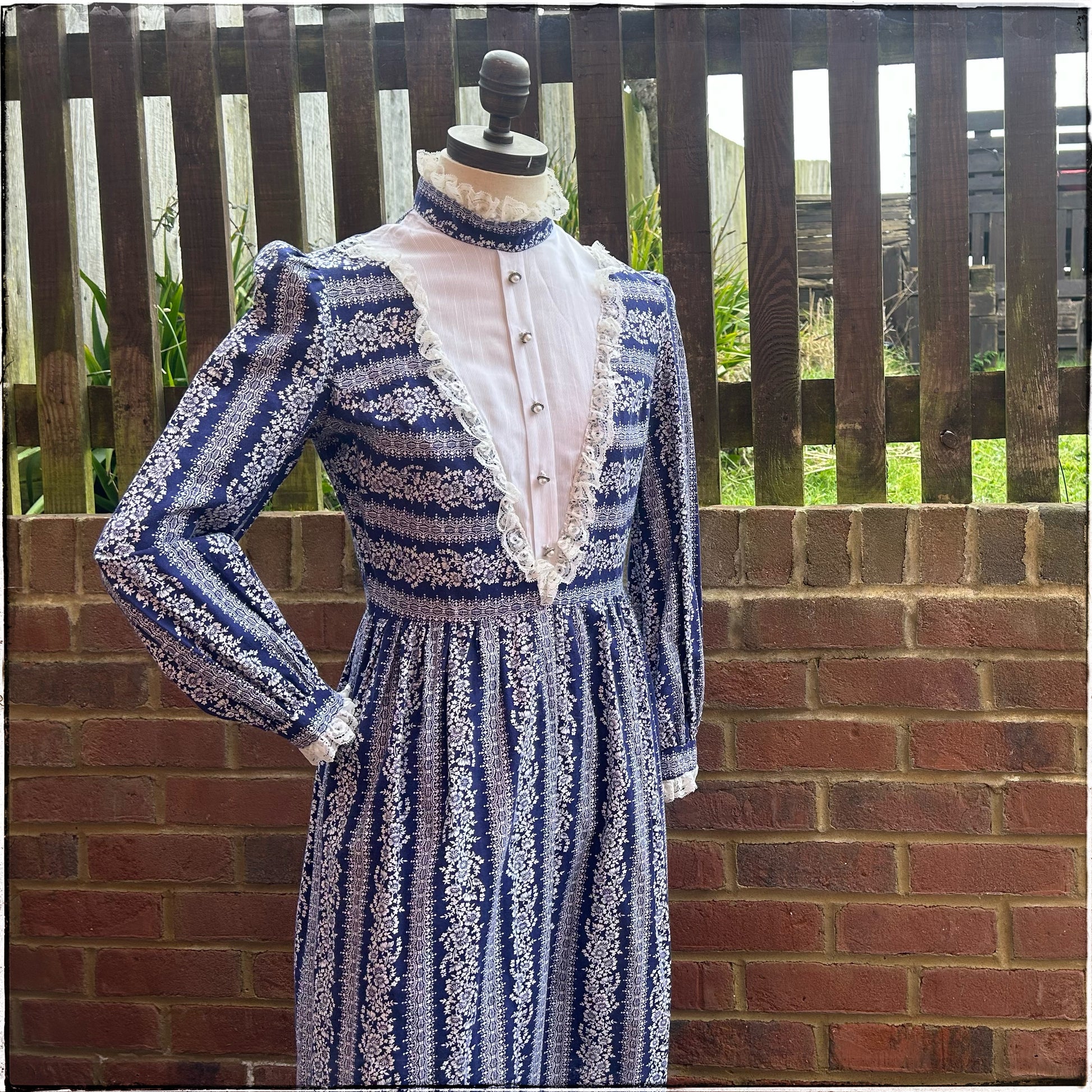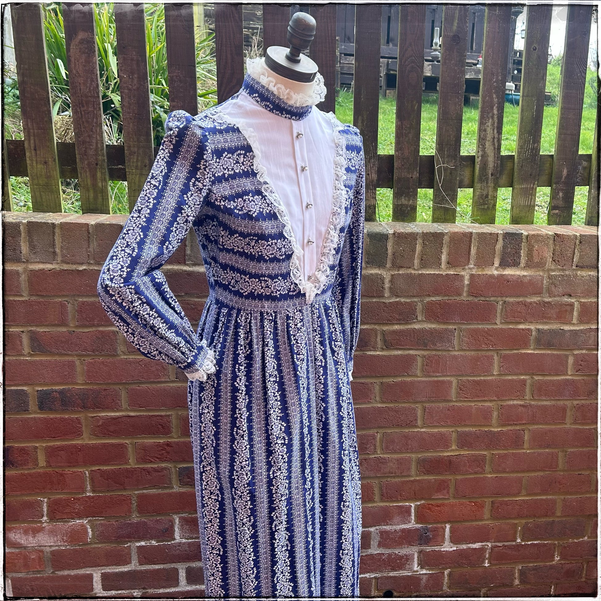Stunning vintage 70s blue and white floral maxi prairie dress by Dollyrockers.