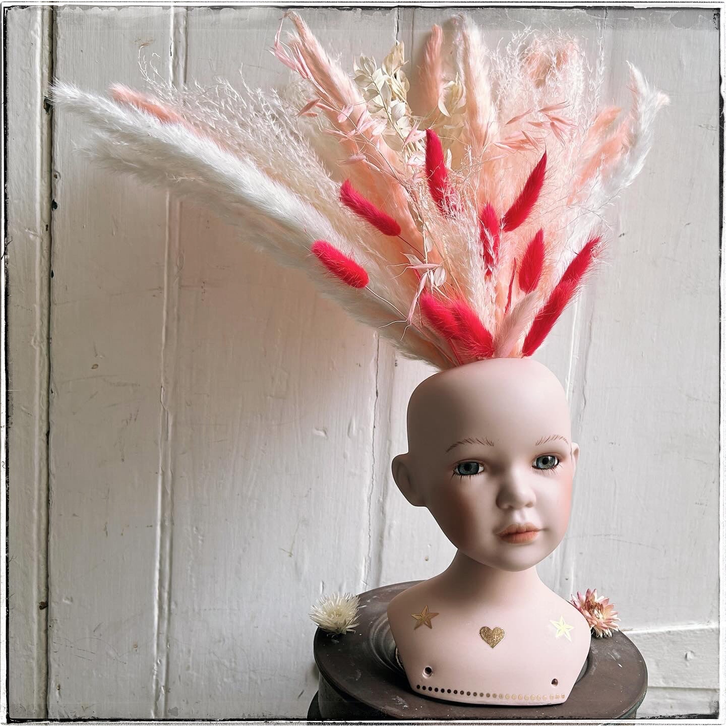 Recycled vintage porcelain doll head with tattoo decoration and dried floral hair arrangement (the flowers are not set to allow them to be changed in the future if damaged or a new colour desired).